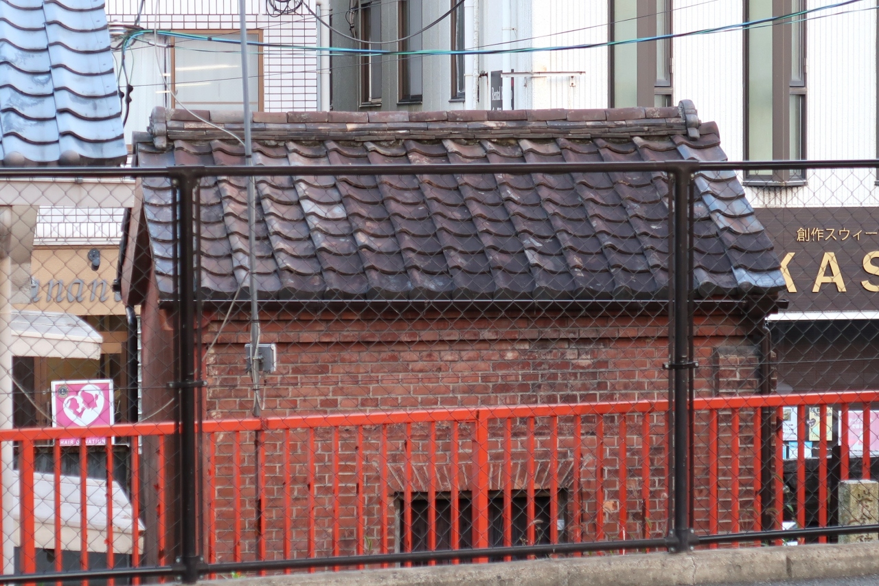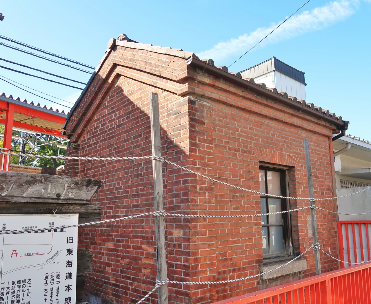 明治13年に完成した赤レンガ造りのランプ小屋で、稲荷駅の改札を出て左側にありました。旧東海道本線時代、稲荷駅の照明や蒸気機関車の客車内の照明は石油ランプが使われていて、この小屋に油が保管されていたため、火事になりにくいレンガ造りの建物になっているそうです。電車のホーム側から見ても、小さな小屋でした。