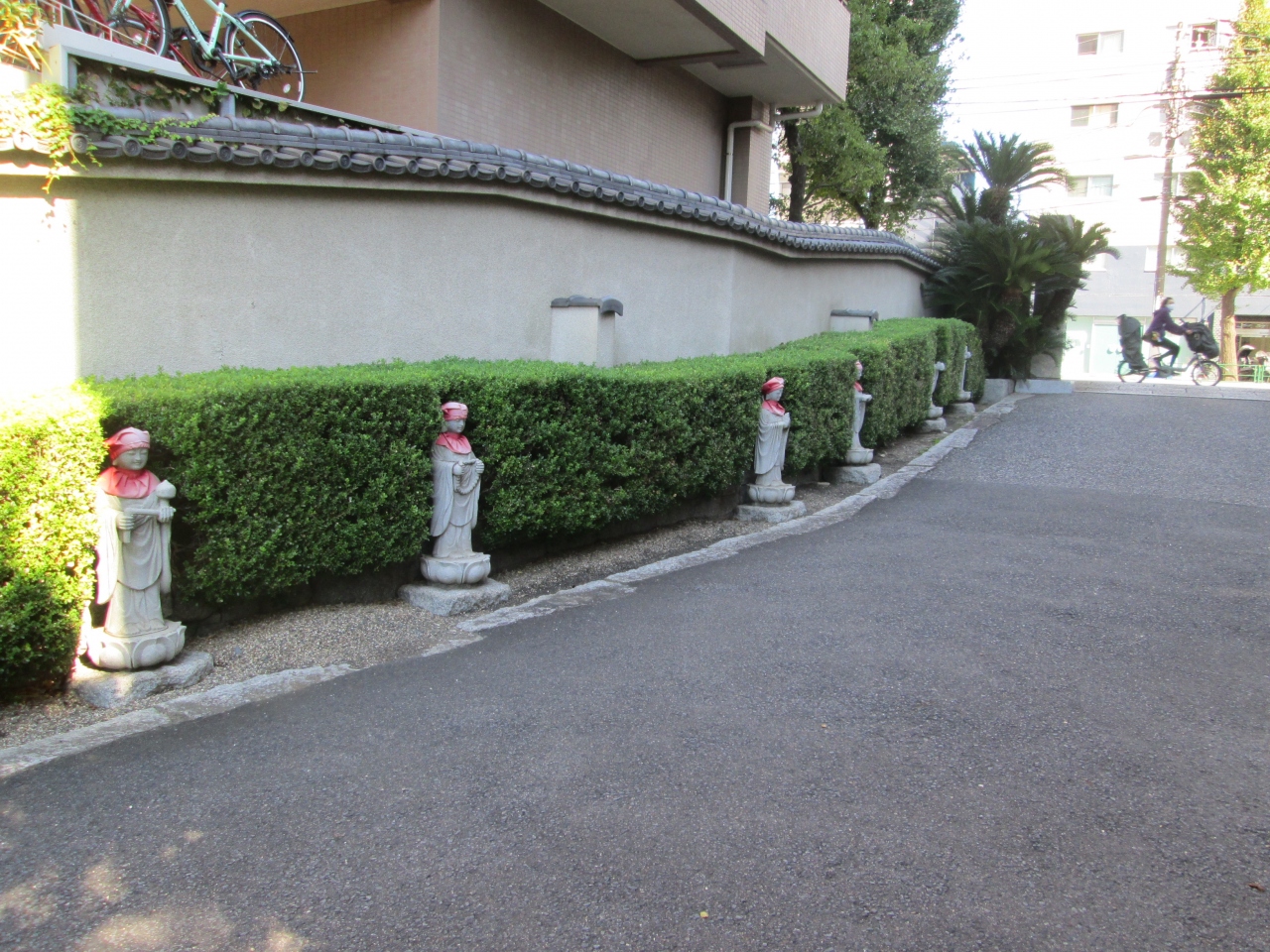 浄土宗の一寺、創建は1626年、開基は村上藩堀家の家臣平井直衛、開山は然蓮社天誉秀公和尚、本尊は阿弥陀如来像です。山門を通ると、参道脇に六地蔵、奥に二階建ての本堂、如意輪観音菩薩像があります。刈り込まれた樹木の間に挟み込まれた六地蔵が印象的です。樹木は刈り込まれ、境内はきれいに整備されていて気持ちの良いお寺です。特筆するスポットはありません