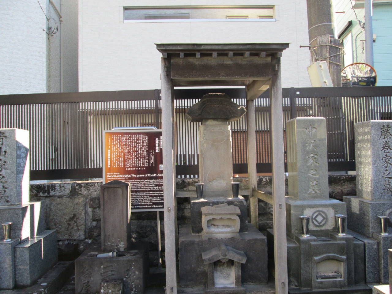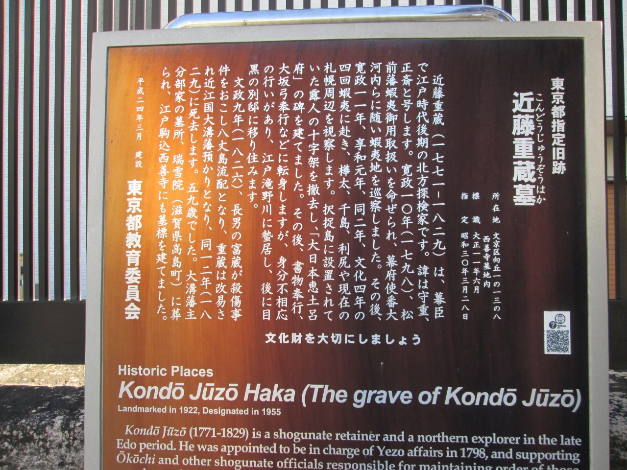 近藤重蔵の墓は西善寺の墓地内にあります。西善寺は浄土真宗大谷系の単立寺院、創建は1616年、開山は了願法師、本尊は阿弥陀如来像です。近藤重蔵は江戸幕府の幕臣で、江戸時代後期の北方探検家です。樺太、千島、択捉、利尻、札幌等を視察します。地図の無い時代に、海を渡り今の北方四島、千島、樺太を視察するという冒険を行った人はすごい勇気の持ち主だと感心します。択捉島では露人の十字架を撤去し、日本の碑を建てたと説明版にありましたが、露人の方が先住民なのでしょうか?