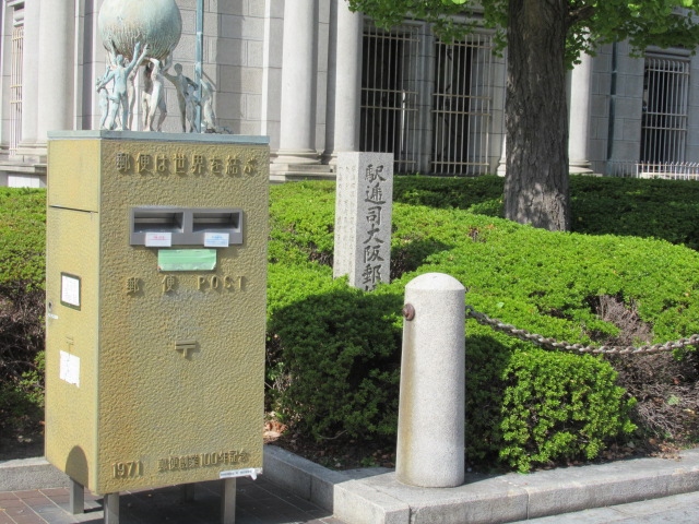 駅逓司大阪郵便役所跡は淀屋橋北詰西側、日本銀行大阪支店の端っこにあります。我が国最初の郵便制度は1871年(明治4年)に大阪から京都東京間が始まりで、この地にあった島原藩蔵屋敷跡に現在の中央郵便局にあたる郵便役所が設置されたようです。現役ポストもあります。設置された当時は東京までの所要時間は約75時間であったようです。現在は48時間ぐらい?当時としては意外と早いと思います。