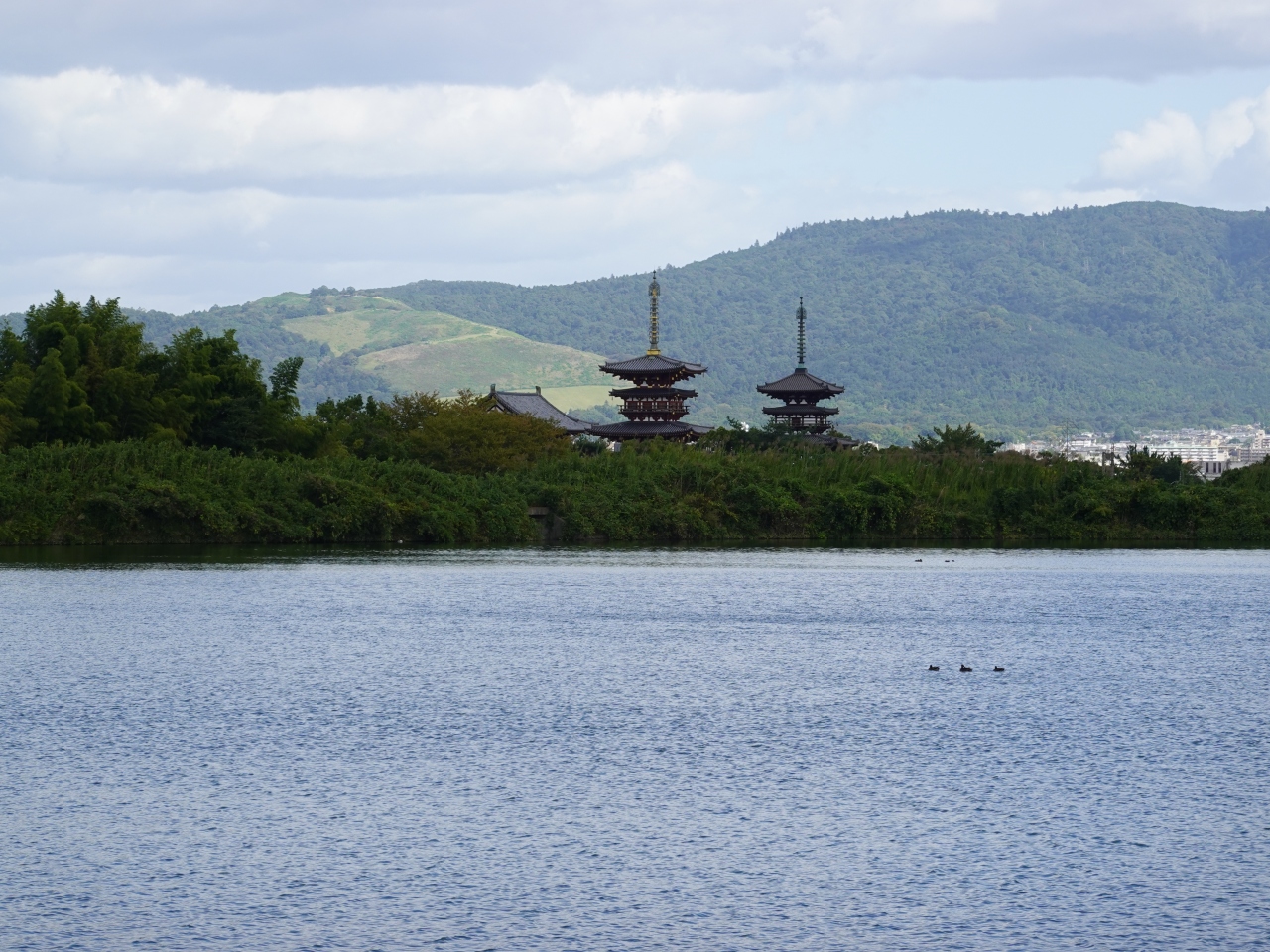 シェアサイクルで西ノ京エリアを観光した際、薬師寺参拝に先立って訪れたのが大池です。ガイドブックにも紹介されている大池越しの薬師寺を見るためですが、まさに絶景でした。大池自体はさほど特徴のない池ですが、その向こうに見える薬師寺の五重塔、さらにその先に見える若草山の景色は奈良を代表する景観のひとつだと思います。