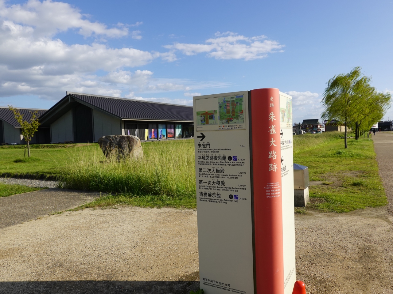 国営平城京跡歴史公園は、広大なエリアを有しており、「朱雀門」「大極門」「遺構展示館」などが点在しているので、私たちはシェアサイクルで回りました。朱雀門の南にはガイダンス施設の「平城宮いざない館」があり、公園内の散策前に立ち寄るもの良いと思います。