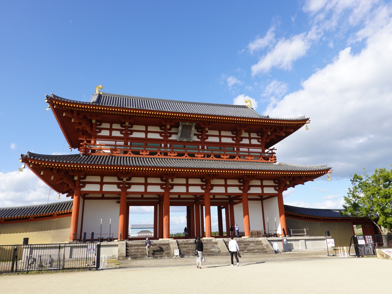 朱雀門は、かつての平城京を南北に貫くメインストリート「朱雀大路」を北に進んだところにあります。現在の門は平成10年に復原されたもので、幅25m、高さ20mの大きさがあります。朱雀門のすぐ北側を近鉄奈良線が東西に貫いており、鉄道ファンとしては楽しい光景を見ることが出来ました。