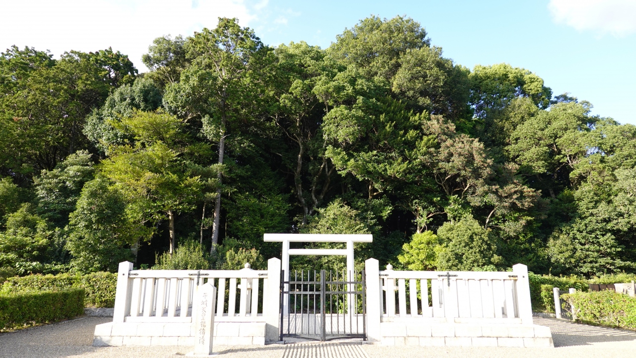 「平城天皇陵」は、平城宮跡の北側にある天皇陵のひとつです。私たちはシェアサイクルで観光していたので、平城宮跡見学のあとに足を運びました。住宅街のややわかりにくい場所にあり、辿りつくのに少し苦労しました。白い鳥居の背後にそびえる緑豊かな木々が印象に残っています。