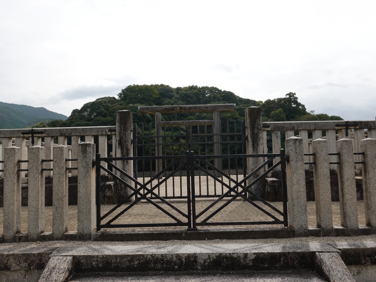 階段を上った先にある拝所からは、濃い緑が印象的な堀の向こうに、こんもりと盛り上がった前方後円墳の姿を見ることが出来ました。全長242メートルと、この界隈では大きな前方後円墳で、見栄えのする光景でした。