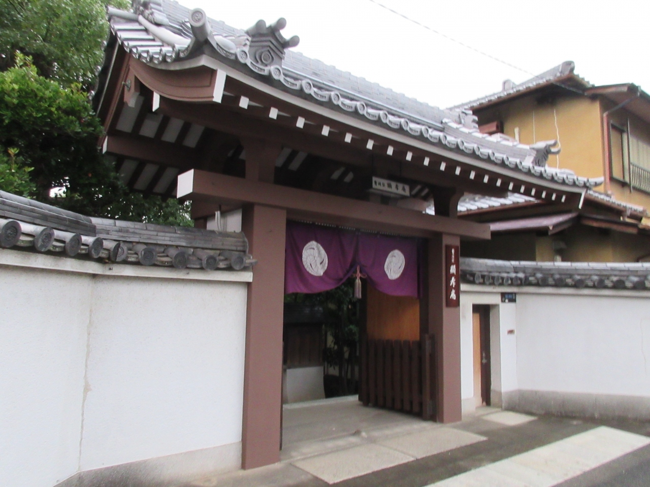 谷町筋から一本西側を南北に走る寺町を散策した際、こちらの【顕孝庵】にも立ち寄りました。「庵」といってもお寺で、山門のところの家紋の入った紫色の暖簾(専門的な用語を存じ上げないので)が色鮮やかで目に焼き付きました。境内はとても狭いのですが、工夫して木々も植えられていました。