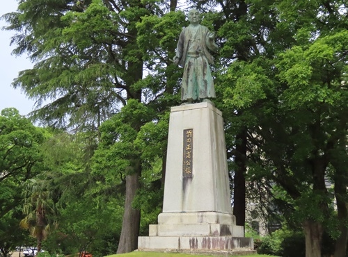 前田正甫は越中富山藩の2代藩主で17世紀後半を生きた人物です。城址公園のほぼ中央付近に銅像が建っています。