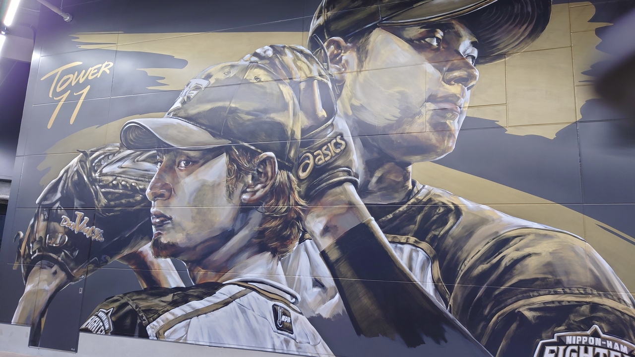 関東にいるのでなかなか北海道までいけないのですが、やっとエスコンフィールドを見に行けました。野球はそんなに見ないのですが、球場もどんどん野球以外でも楽しめる場所になっているそうなので、ゲームはないのにいってみてビックリ。ゲームはないのに館内はかなり人がいて賑やかでした。飲食店もSHOPも開いている。子どもの遊び場ももちろん温泉も。どこよりも人がいたのが大谷とダルビッシュの壁画みたいな所の前。