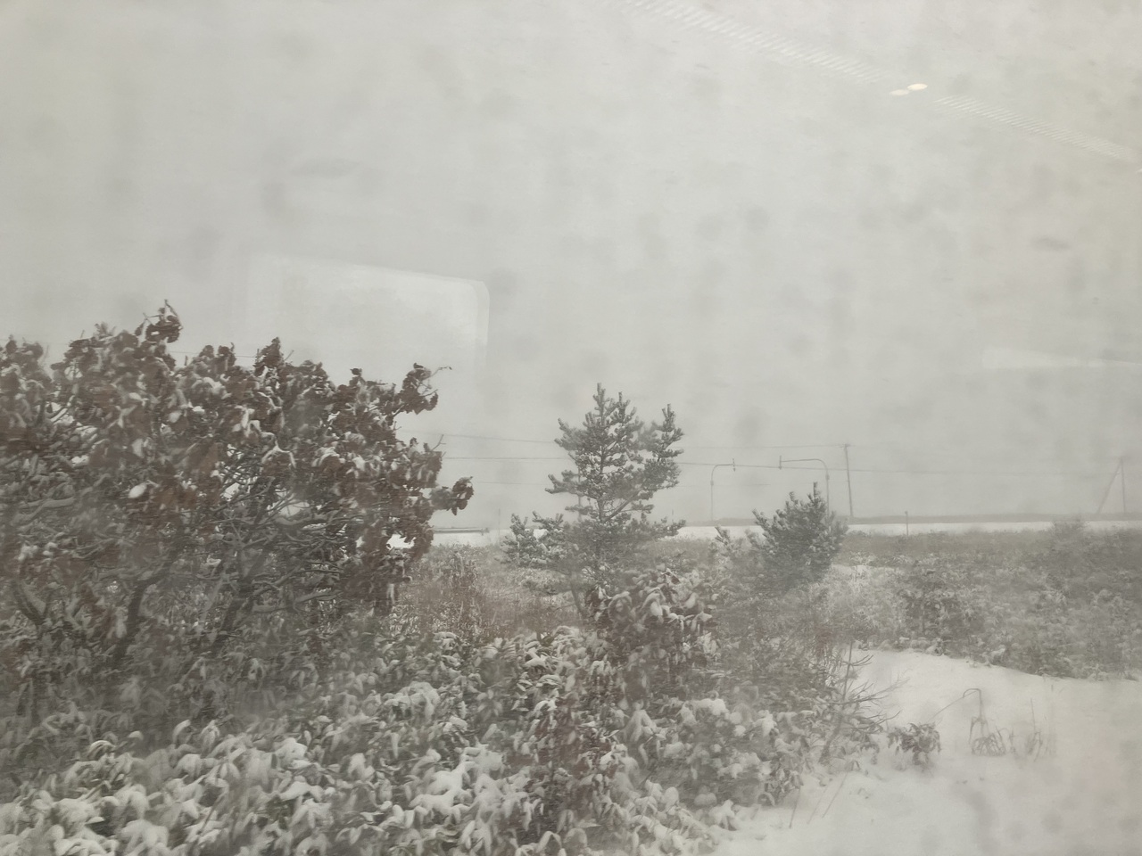 特急なので、列車は広々しており、2×2の構成でした。私は進行方向に向かって左側の窓側に乗りましたが、海の見える方向だったので景色がとてもきれいでした。東室蘭を超えたあたりで雪がパラつき始め、そこから先はずっと吹雪でした。北海道に来ている実感ができ、とても良い景色でした。