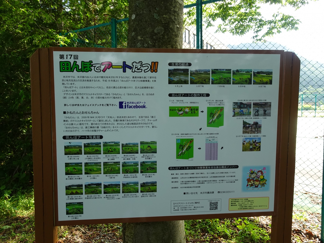 小野川温泉に宿泊した際に立ち寄りました。宿泊した河鹿荘からすぐの所に、「小野川温泉田んぼアート」がありました。無料の駐車場があります。「田んぼアート」の生育の経過や製作工程など、パネルでしっかり紹介されていました。第17回目は直江兼続のマスコットキャラクター「かねたん」と直江兼続の妻「お船の方」をイメージしたマスコットキャラクターです。愛らしいキャラクターでほんわか気分になれました。