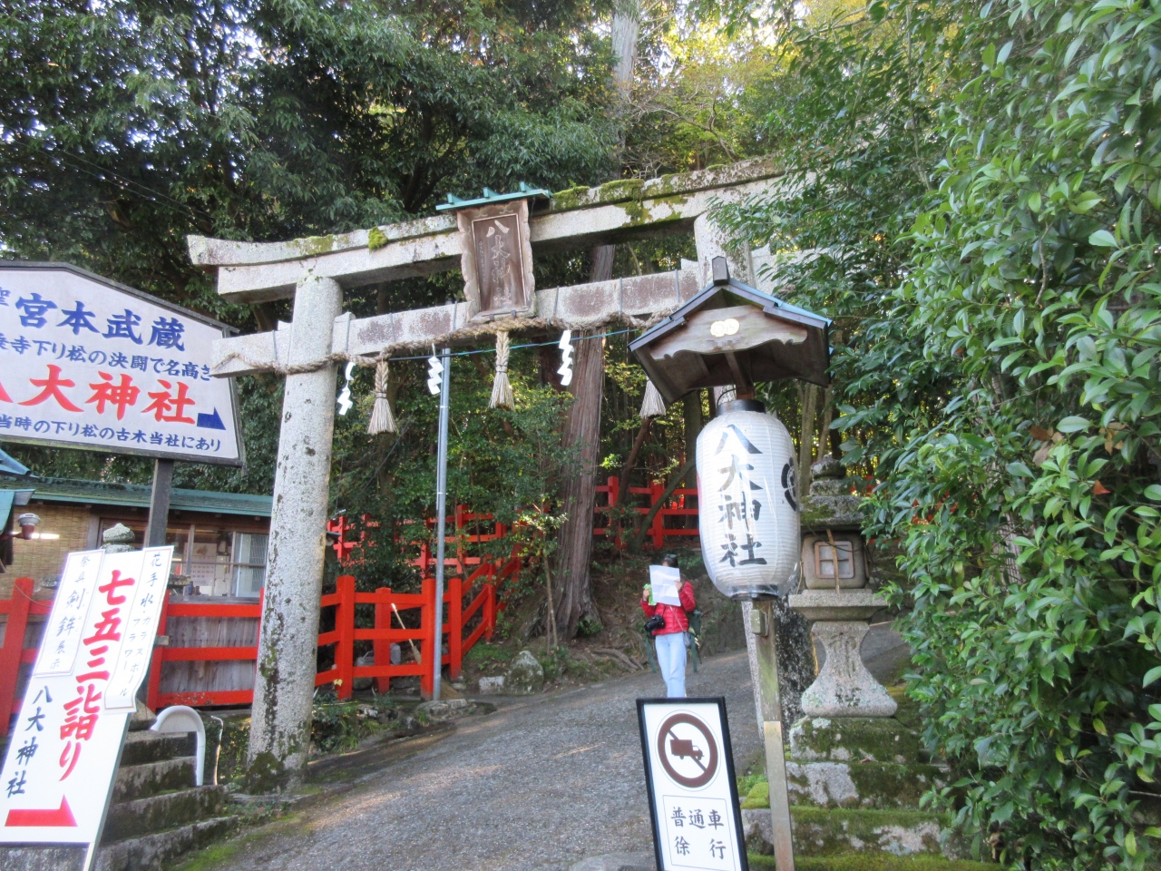 祇園神社から一乗寺の産土神として歓請されて創建されたそうである。詩仙堂の隣にある。宮本武蔵が一乗寺で決闘する直前、八大神社で神頼みを思い立ったものの神仏に依存しようとした自分の弱さに気付き、祈りを止めたというエピソードが残っているそうである。社殿には一乗寺下り松の古木が保管されている。