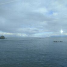 JR氷見線に乗っていて、目の前にパーっと飛び込んできました。息を飲むような美しさに、思わず声をあげて、感動しました。日本海と、松の木と思われる木の乗った小さな島、遠くに見える立山連峰、本当に素晴らしかったです。