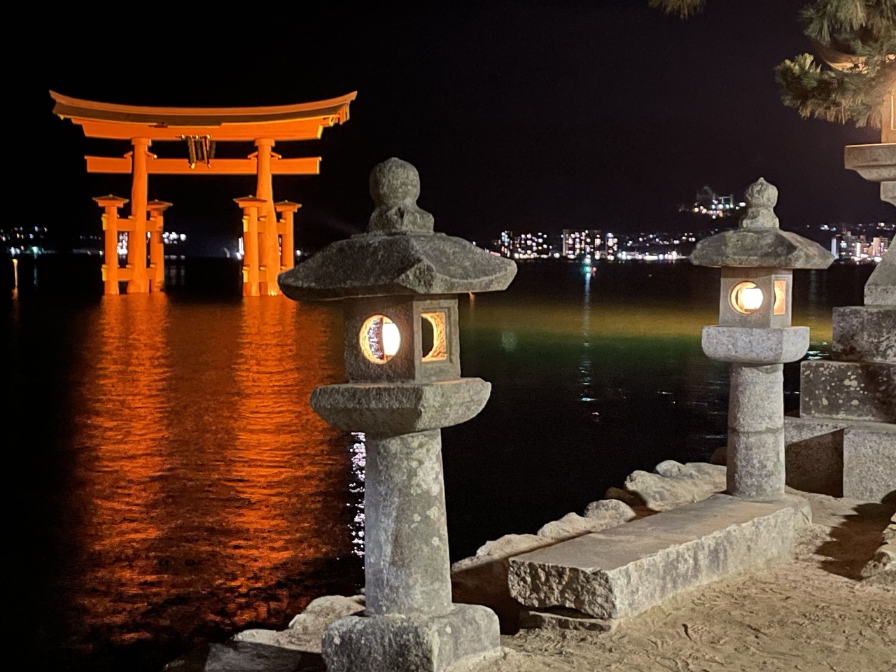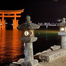 宮島島内の旅館に宿泊しました。日中は観光客で混雑した宮島も静寂に包まれていますが、大鳥居周辺は観光客が集まっていました。大鳥居をメインに厳島神社の境内や五重塔などが美しくライトアップされます。宿泊した人だけの特権です。