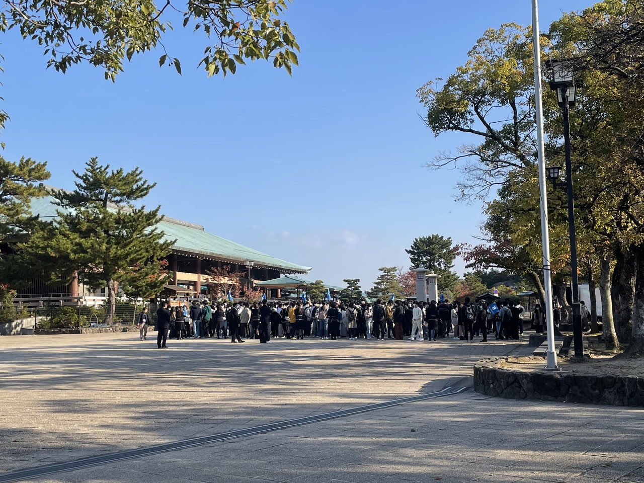 11月中旬の平日の昼下がり、たくさんの修学旅行生やインバウンド、グループが集まっていました。島を散策後の最終集合地点にもなっているようです。陽ざしは暖かく、鹿が相手をしてくれます。唯一と思われるコンビニもあります。