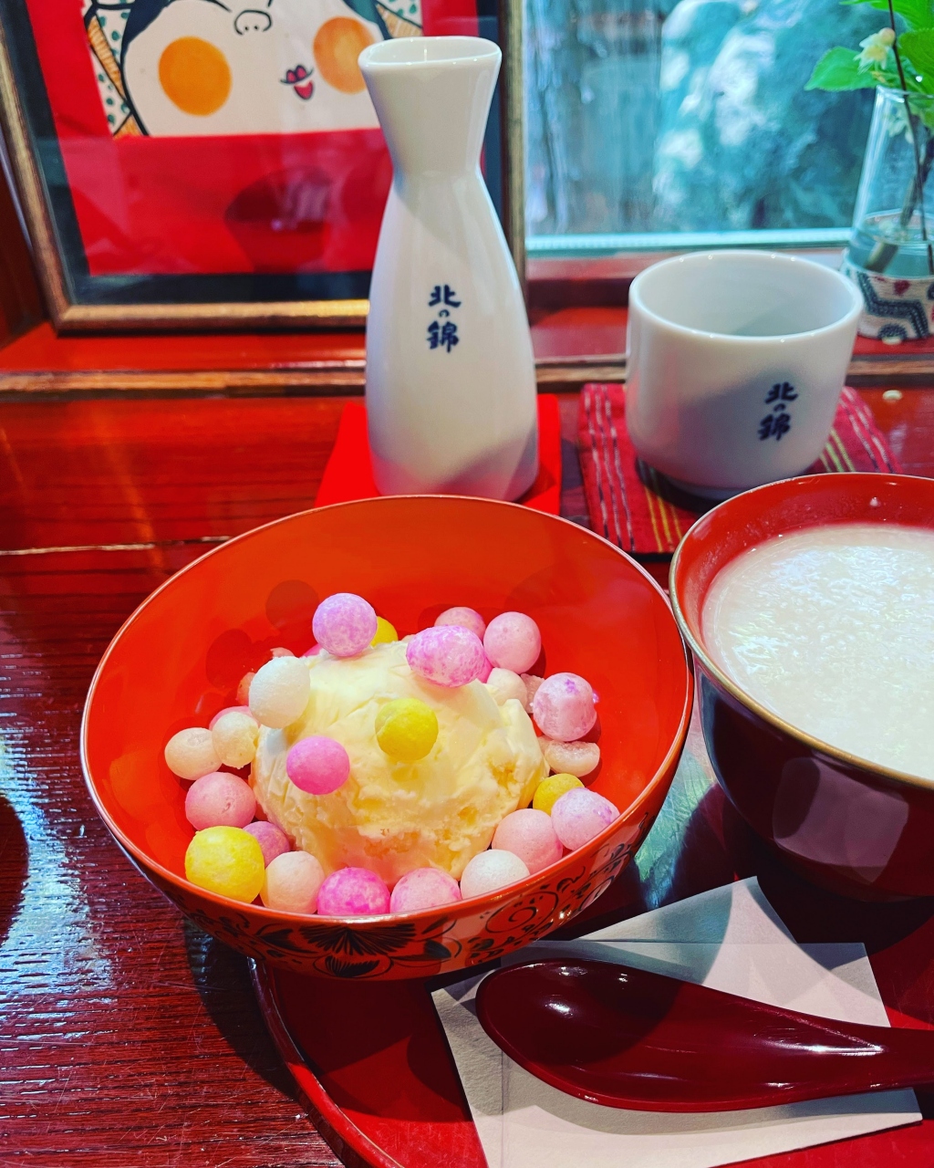 小林酒造の社長宅の家屋を利用した和カフェ。蔵の見学した後、お茶休憩で利用しました。今回頼んだのは「おいり甘酒」。香川のおいりを載せたアイスの上から温かい甘酒をかけて食べるというもの。コーヒーとアイスのアフォガードに近い食べ方でいただきます。新しい味でした。古さに趣きのある建物ですが、2013年まで社長宅として使われていたと知り、それもビックリ!家屋内の案内見学でスタッフの方が説明してまわることもやっていました。今回は、その案内ツアーに参加しなかったので、次回ぜひ参加したいと思います。