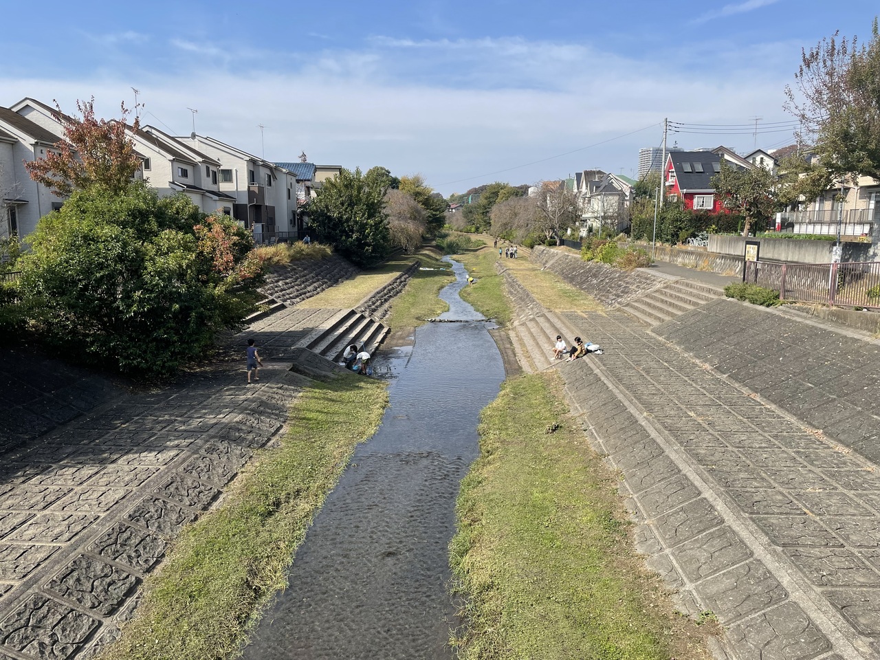暖かい11月の休日の昼下がり、川に入ってはおりませんが、虫かごをもって水遊びをする地元の家族連れが見られました。川岸はきれいに除草されており、遊歩道では散策もできます。冬は近づいており、すすきももう終わりでした。