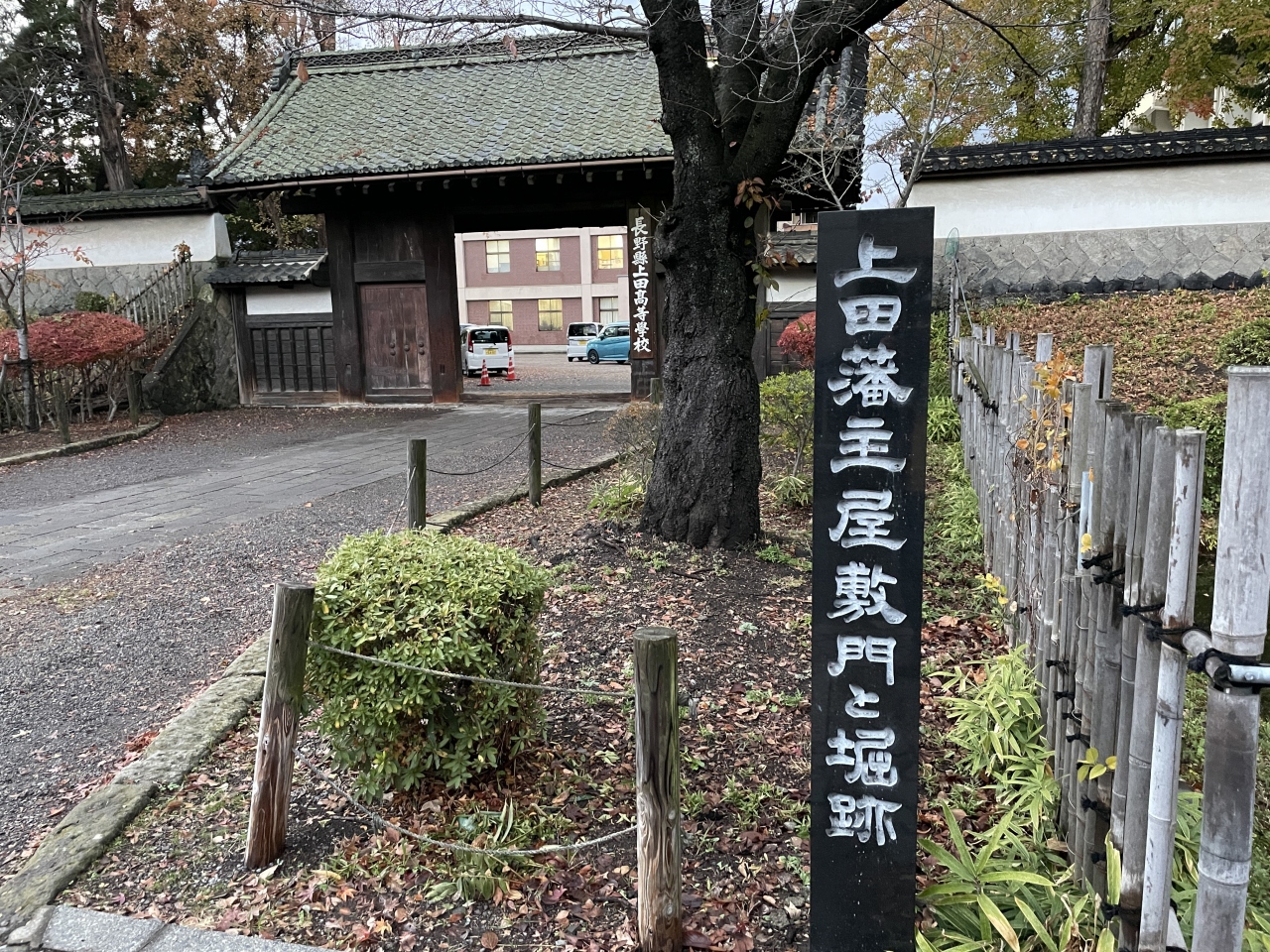 上田藩主居館跡は現在県立上田高校の敷地になっています。屋敷部分の遺構は残っていませんが表門とそれに続く土塁や濠、土壁の一部が現存遺構になっています。この表門は現在も上田高校の正門として使われています。まるで上田の藩主たちが今の高校生の学校生活を見守っているようですね。