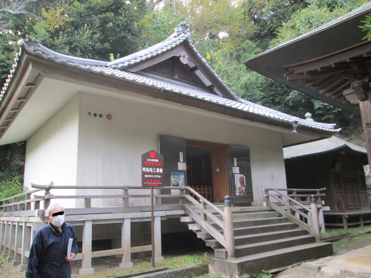 真言宗泉涌寺派の一寺。 1251年創建。 開基は鎌倉第六代執権北条長時、開山は真阿和尚。本尊は阿弥陀三尊像です。室町時代には足利氏の帰依を受けている。伽藍は山門をくぐって、楊貴妃観音、右手に鐘楼と不動堂、左手に客殿、石段を登り、すぐにイヌマキの木、正面が本堂(仏殿、三体の阿弥陀如来像が安置されている)、左手に国重文阿弥陀三尊像(阿弥陀如来像、観世音菩薩像、勢至菩薩像)が収められている収蔵庫(本日は御開帳)、その奥、観音堂、右手には鶴岡八幡宮の神主大伴神主家の墓所がある。本堂の左手奥に石段があり、これを暫く登ると網引地蔵、さらに登ると冷泉為相の墓の墓がある(超ミニハイキングです)。四季おりおりの花(スイセン、桜、ツツジ、萩等)が見られる花の寺としても有名です。ともかく、見るものが多く飽きさせません。特に収蔵庫に安置されている阿弥陀如来像(写真撮影禁止)は、金粉は殆んどはがれているように見えますが、ちょっと珍しい上品中生の印を結んだ優し気な顔を持った阿弥陀様が私を見つめてくださっている感じがしてうれしく思いました