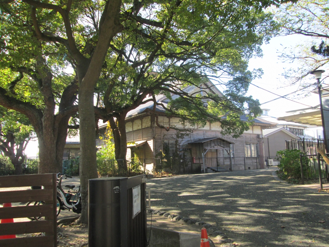 明治天皇皇女のための御用邸跡地に、1933年に鎌倉市立御成小学校が開校し、正門には御用邸の冠木門が引き継がれています。門標は高浜虚子書です。東京の小学校では見られない風景です。正門から中を見ると、左手に国登録有形文化財の旧講堂が見られます。大きな歴史を感じさせる木造の講堂で、屋根には塔が建っています。門は開いており、守衛さんも不在でしたが、セキュリティーが厳しい今、門から少し覗き講堂の写真を撮影して、学校から離れました