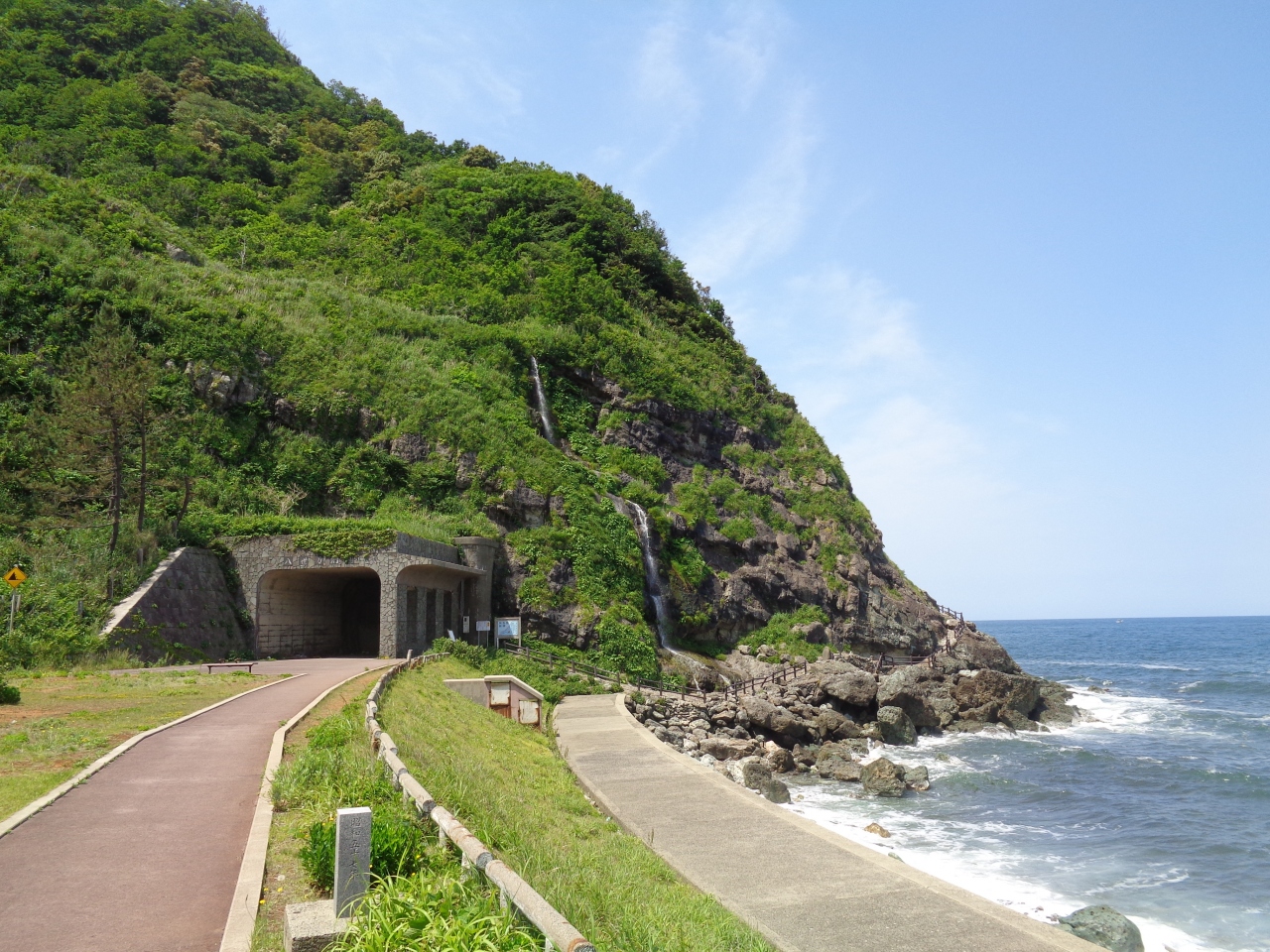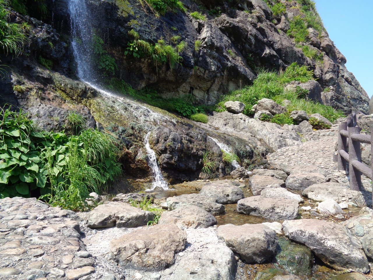 輪島市と珠洲市を結ぶ八世乃洞門の珠洲市側にある滝です.駐車場はトンネルを抜けて直ぐに真浦ポケットパークという場所に無料で駐車できるスペースがあります.滝自体の水量は多くありませんが,この滝は水量が少ない分だけ,冬は日本海側からの強い北風によって水が下に落ちずに舞い上がることから,吹上の滝とも呼ばれているそうです.今回は夏の訪問だったので,そういう光景は見られませんでしたが,その分,海岸沿いに歩いて滝壺まで行くことが出来ました.