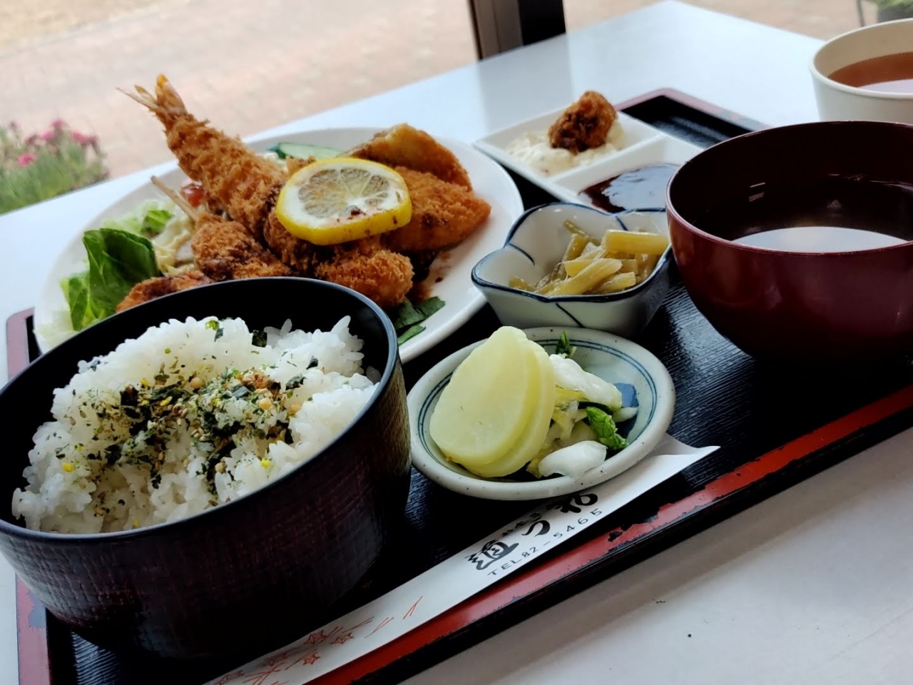 珠洲市でランチの場所を探していて,口コミの評価が良かったので行ってみました.シーサイドショッピングプラザという建物内にあるフードコートのようなお店で,基本的にセルフサービスです.ふりかけなどはお好みで自由に使えました.今回はミックスフライ定食を注文しましたが,イカやエビなど計5種類(魚フライは二つに切ってあるので計6個)のフライに加え,小鉢が二つ付いていました.ご飯の量も多く,食べきれないくらいでした.サラリーマン等の昼食でもよく利用されているようで,買い物客以外のお客様も大勢いらしているようでした.