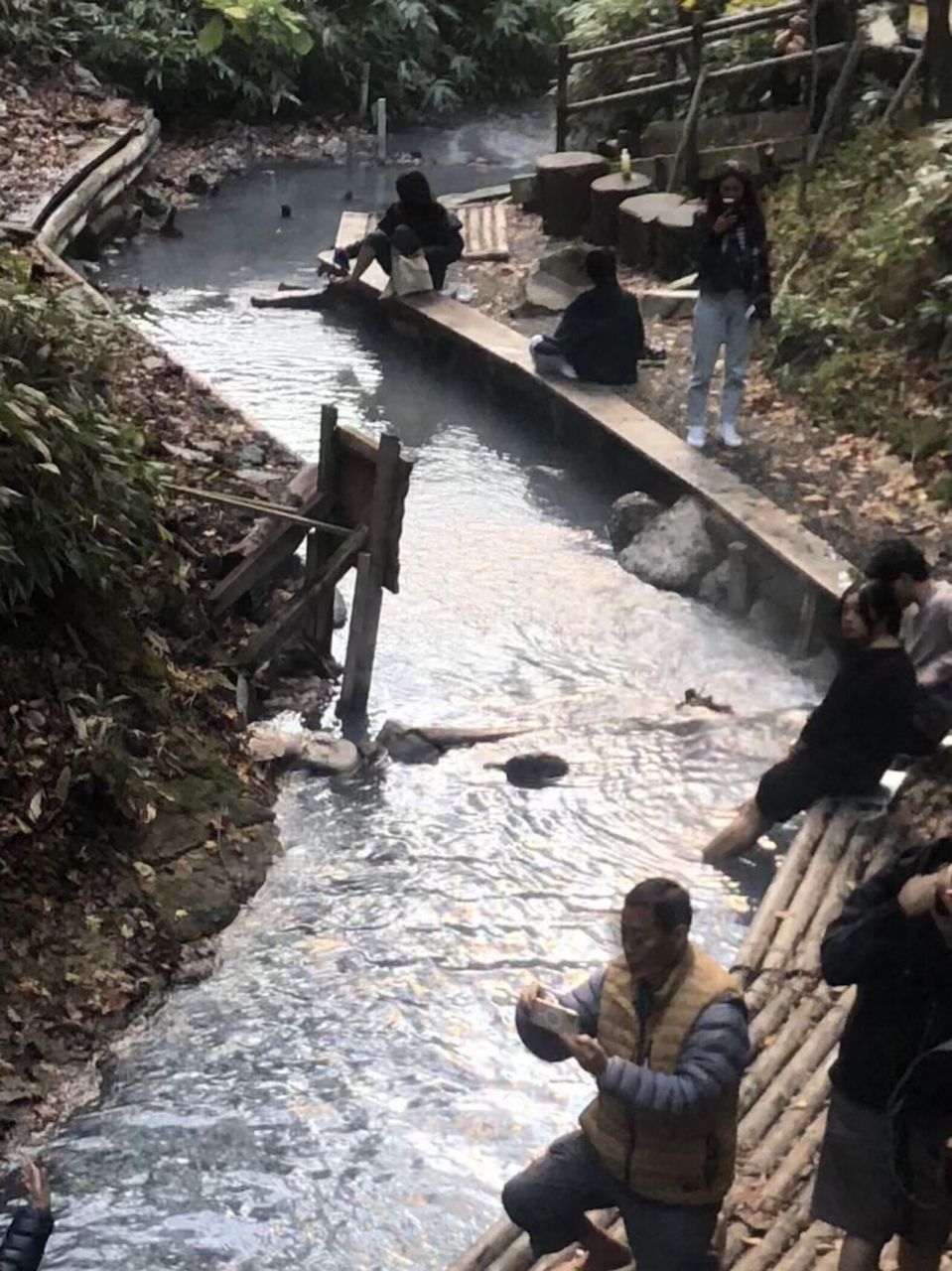 大湯沼川天然足湯は、旅の情報番組で知り、登別温泉に行ったら是非に、行きたい場所でした。大湯沼からあふれ出た酸性度の高い湯が流れている川で、流れるうちに適温になる、ちょうど良い場所が足湯のある場所だそうです。無料で自由に楽しむことができますが、足ふきのタオルを必ず持参してください。
