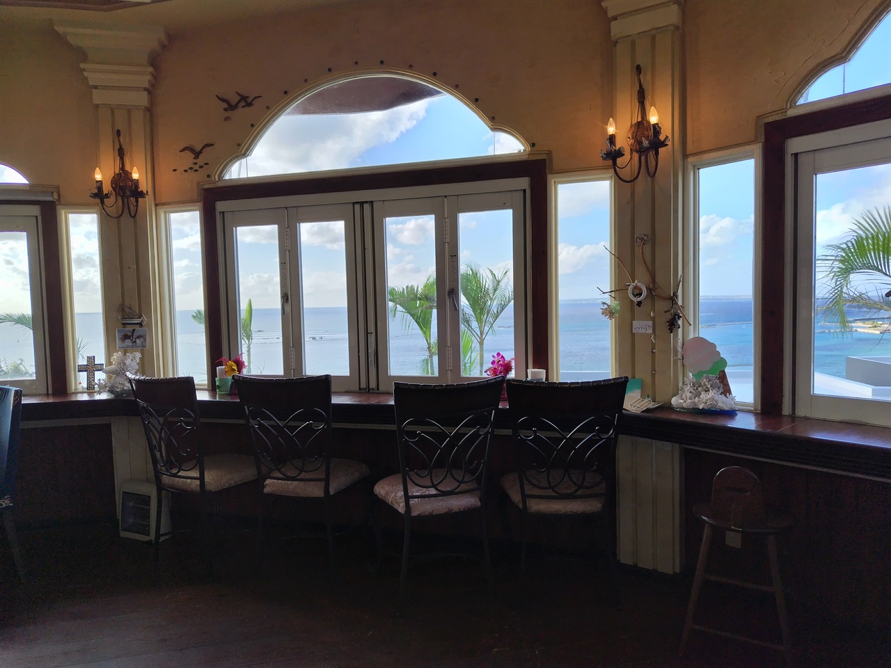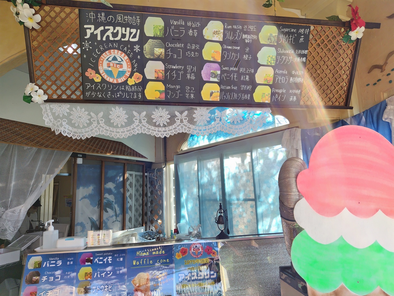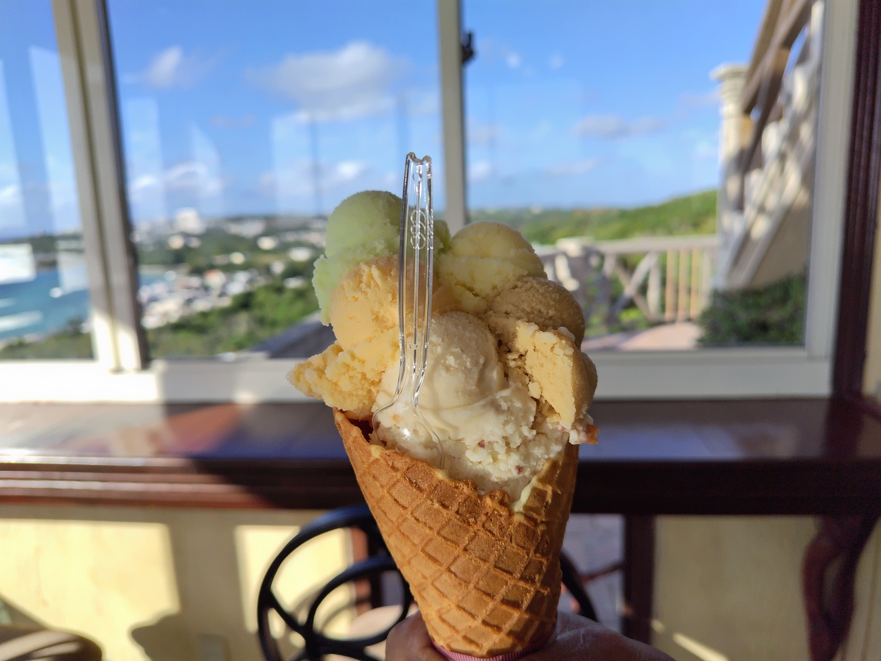 店舗へ。店内に入ると真っ青な海が眺められるお洒落な窓側の席とピアノがあるお部屋も素敵でした。更に3階には螺旋階段で上ると窓の開口部が広く眺望が最高のテラス席。2階でオーダーして3階で食べました。ワッフルコーンは手焼きで微かな塩が効いてサッパリしたアイスクリンと相性抜群で美味しかった。