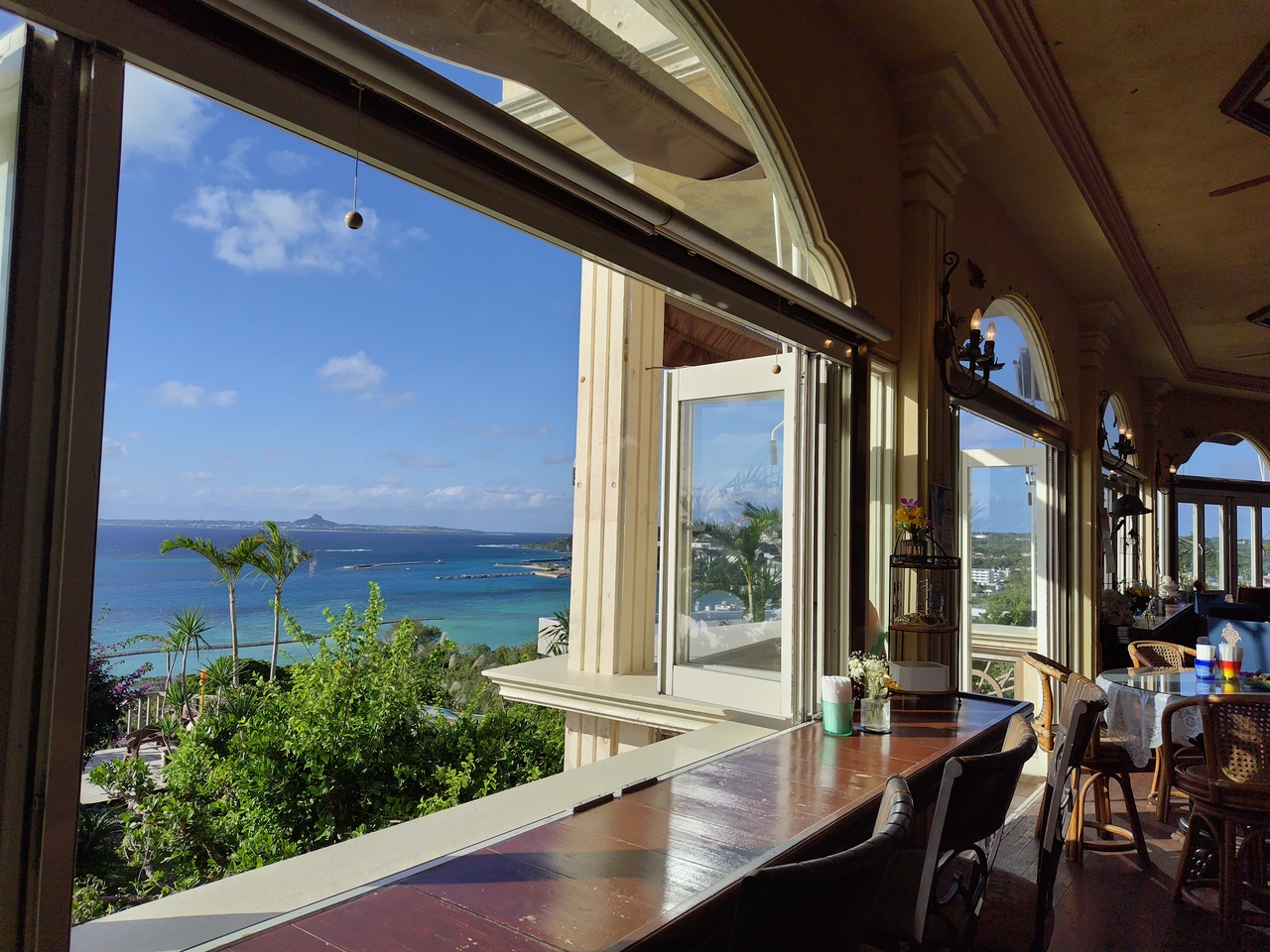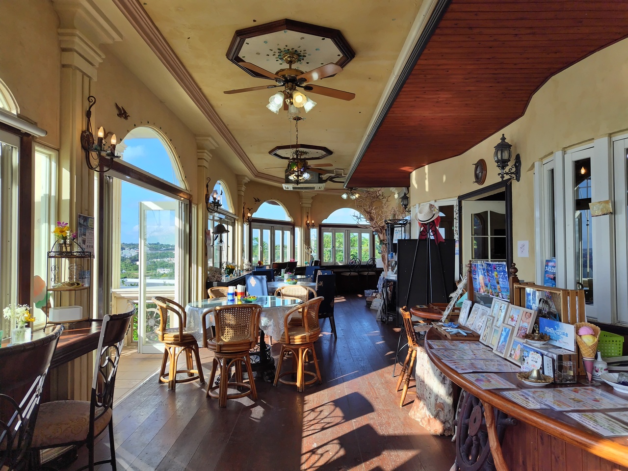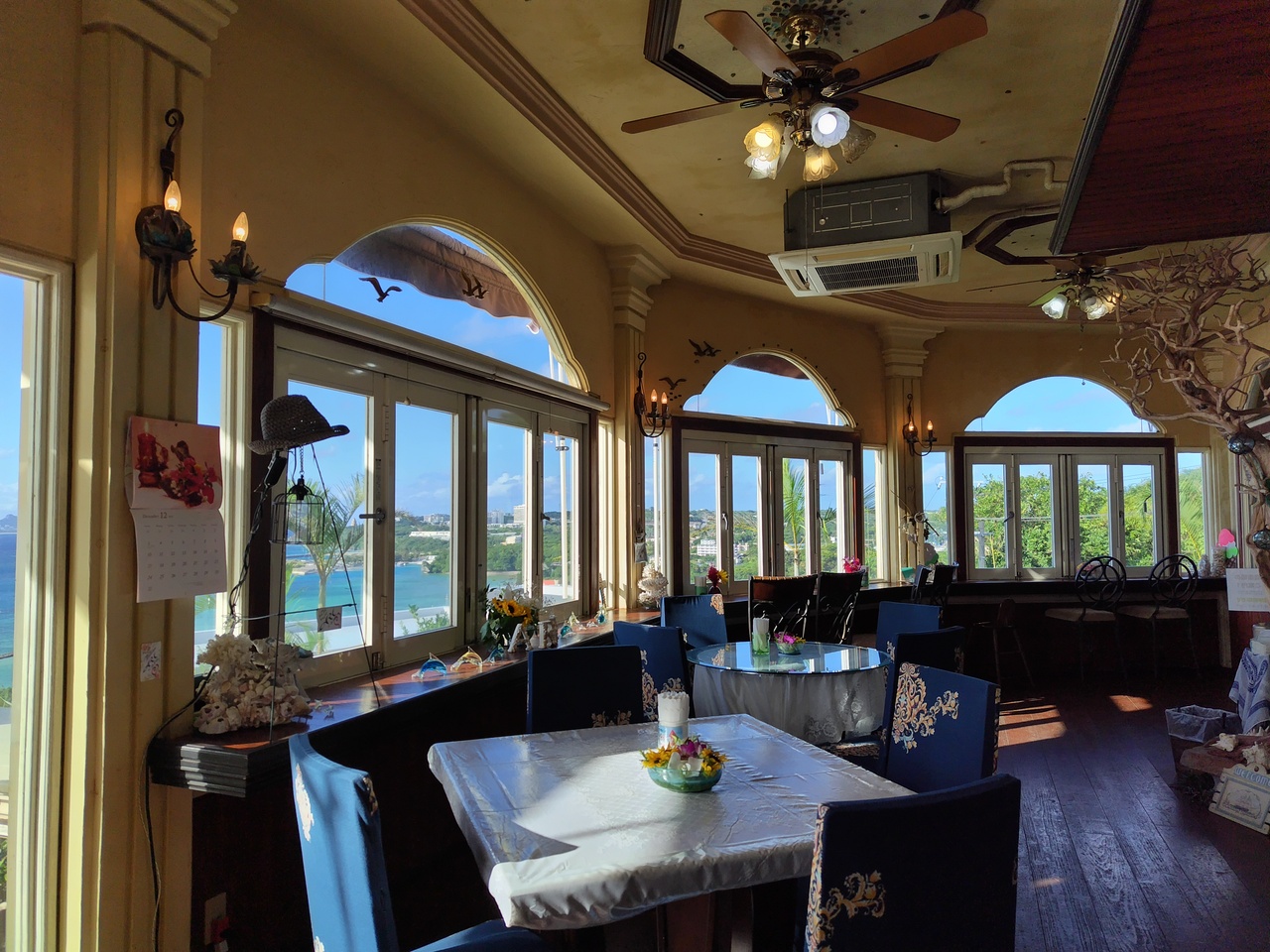店舗へ。店内に入ると真っ青な海が眺められるお洒落な窓側の席とピアノがあるお部屋も素敵でした。更に3階には螺旋階段で上ると窓の開口部が広く眺望が最高のテラス席。2階でオーダーして3階で食べました。ワッフルコーンは手焼きで微かな塩が効いてサッパリしたアイスクリンと相性抜群で美味しかった。