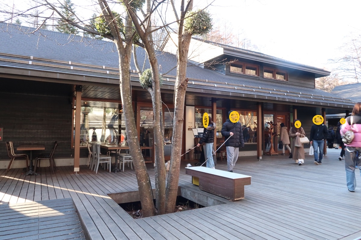 敷地内に入るとセンスのよい店舗が並び、ウッドデッキが敷き詰められて森の木立とマッチしたきれいなショッピングモール。