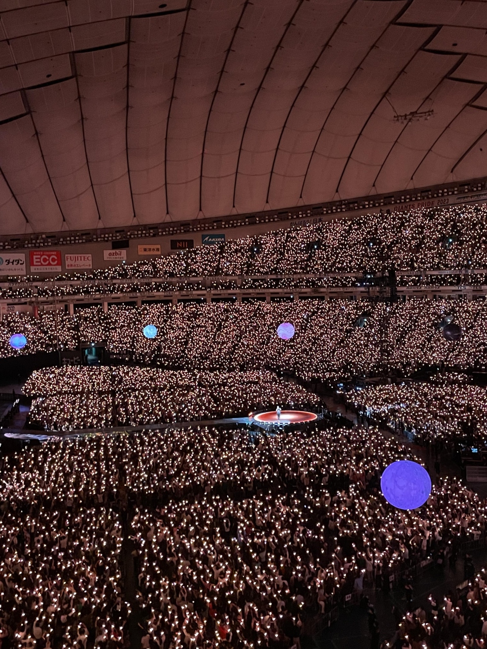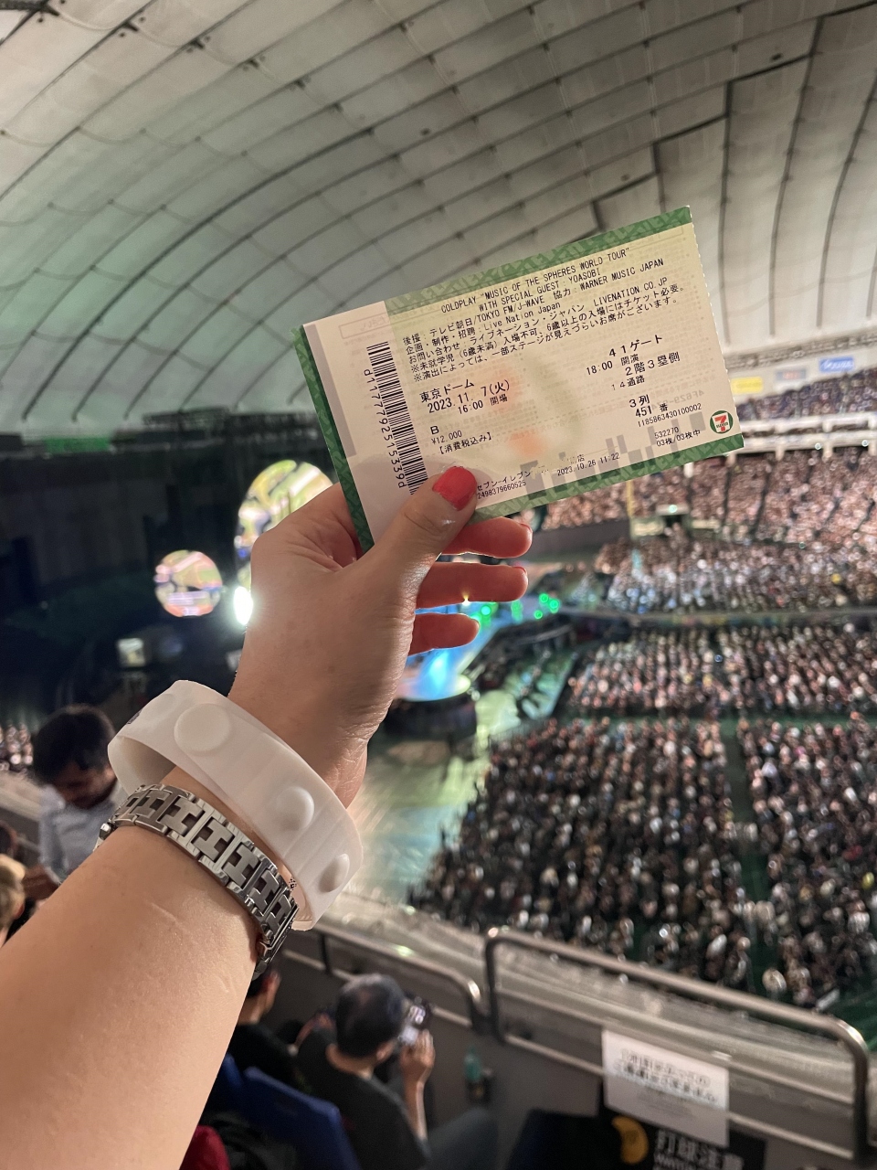 コールドプレイのコンサート鑑賞のため、初めて東京ドームへ。実際に入ってみて、その大きさに圧倒されました。前座がYOASOBIという豪華な夜。三塁側の最後列の席で、クリス・マーティンは米粒のように小さかったですが、大スクリーンがあり音響も申し分なかったので、存分に楽しむことができました。