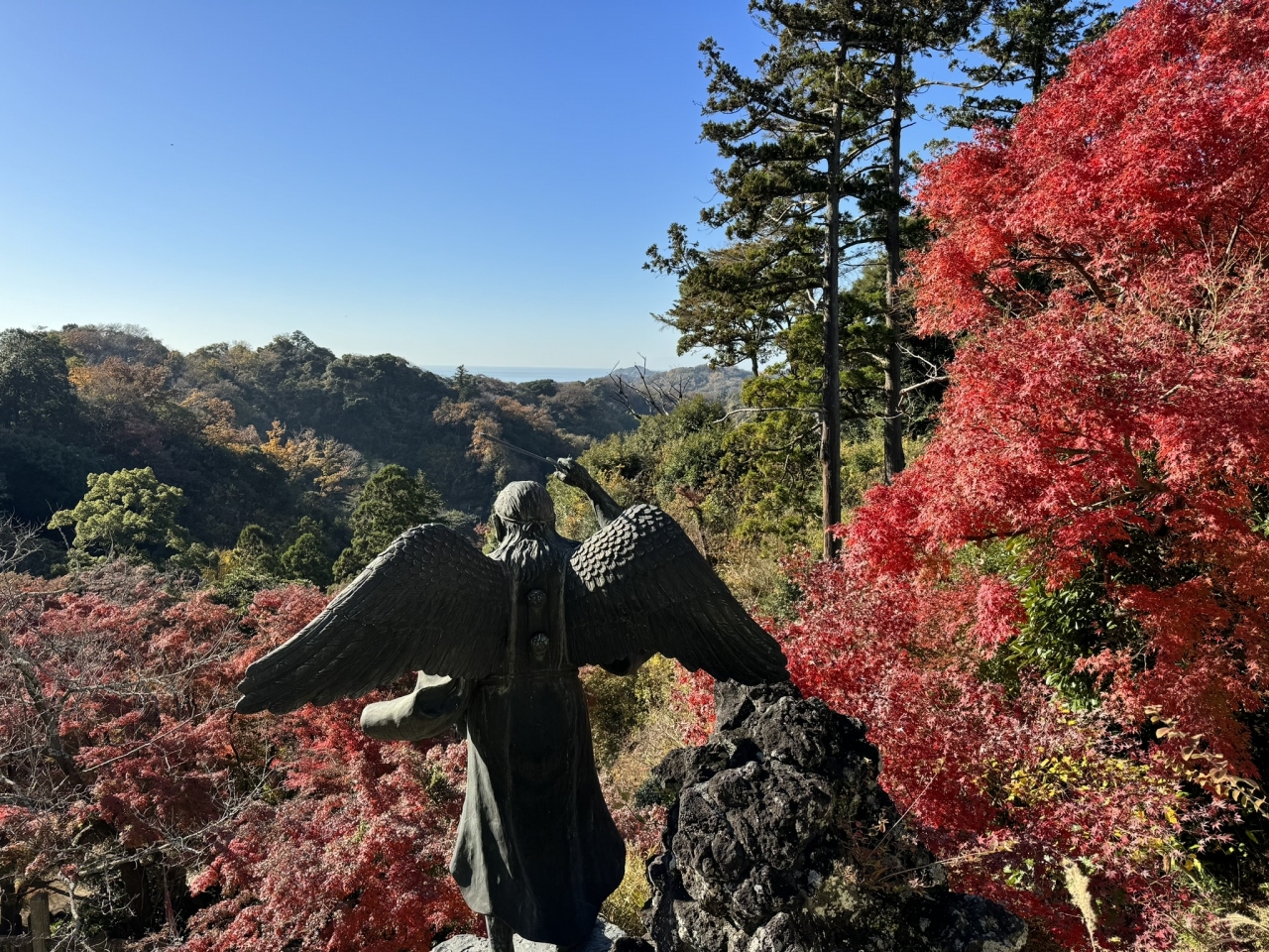 建長寺の総門から歩いて15分、建長寺の奥にある山(鎌倉アルプスの一部)の上に、半僧坊があります。半僧坊本殿が建つ崖には、約10体の大小のカラス天狗の像があり、異空間のような雰囲気です。半僧坊の本殿前まで上がると、カラス天狗の後側から、建長寺周辺の鎌倉の街並みを見下ろすことができ、登り坂はきついですが、苦労していく価値があるところです。
