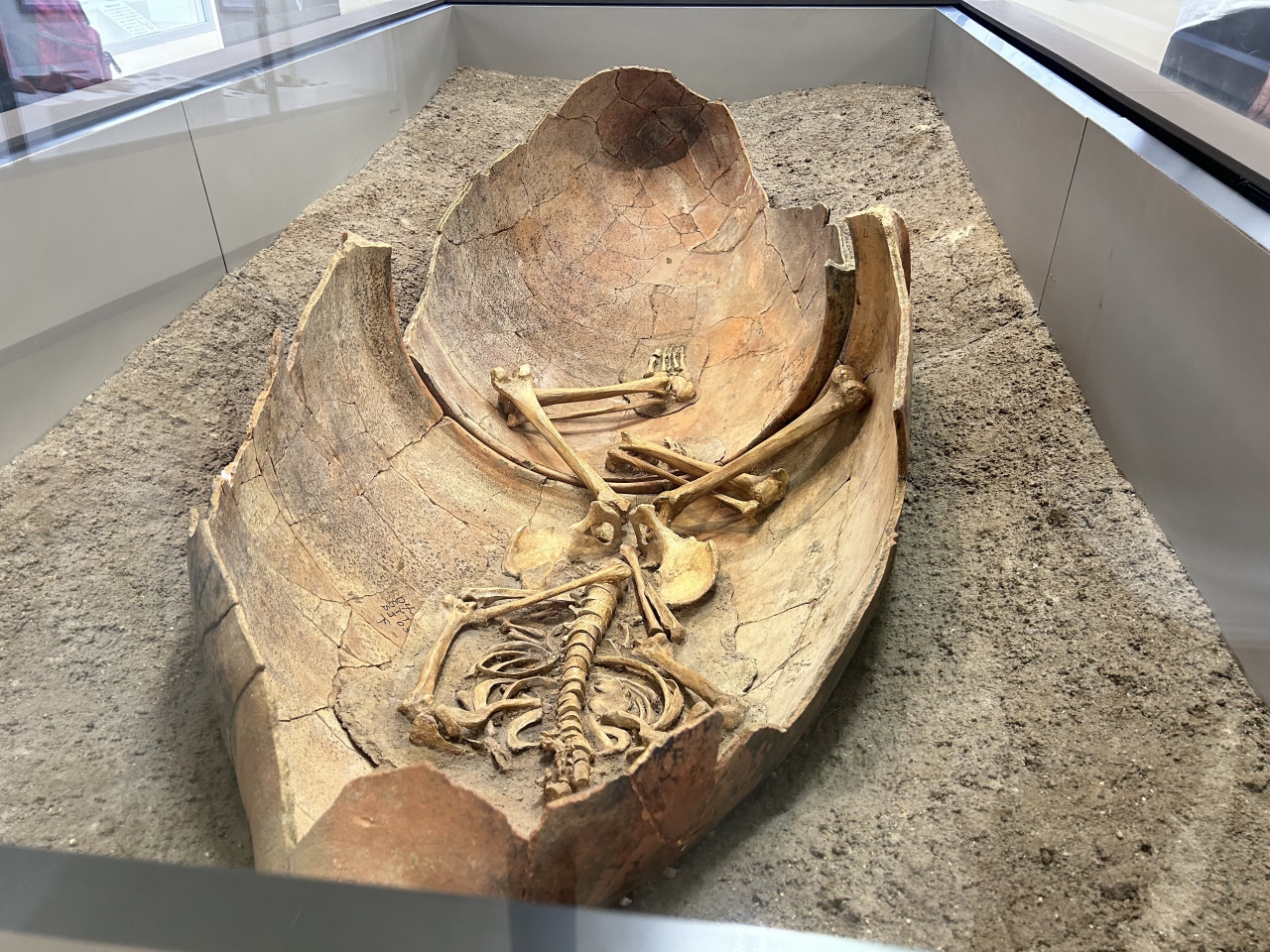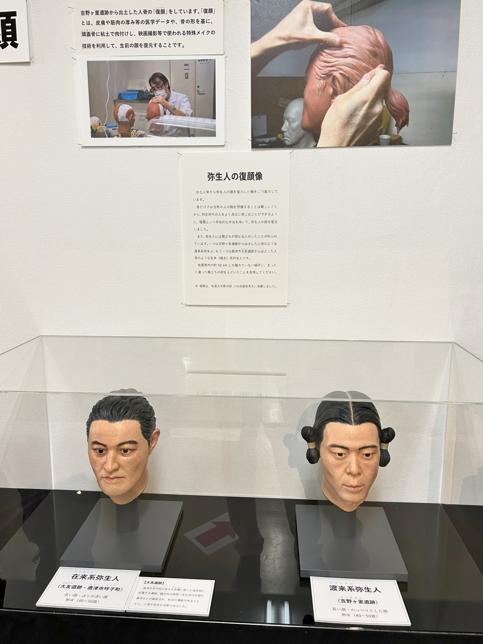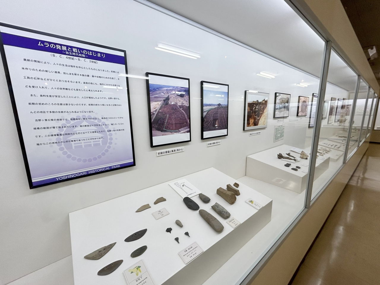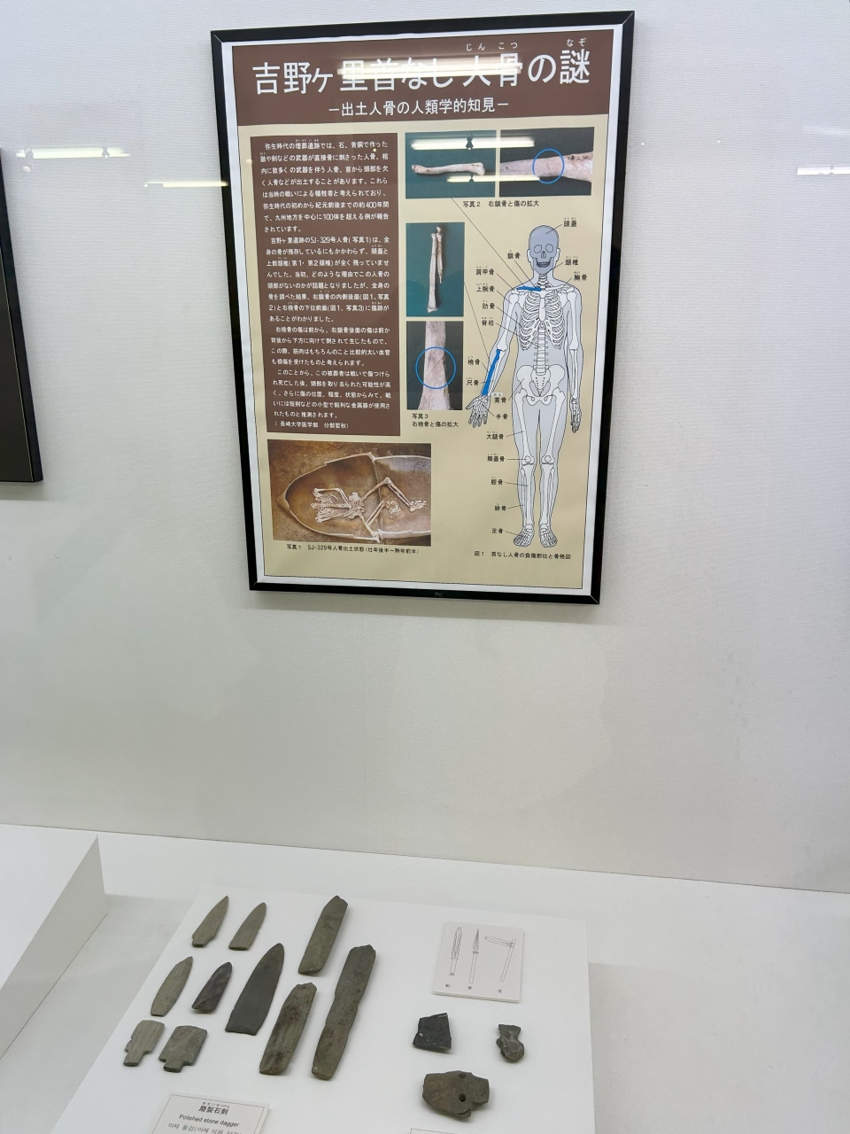 遺跡巡りの前に「吉野ヶ里遺跡展示室」にて勉強です。予想していたよりこじんまりとした展示室です。建物も古そうなので昔からある展示室なのでしょうか、概ねシンプルな展示のみの印象です。後で立ち寄る北墳丘墓などの方により詳しい解説があるので、ここはこれで残しておいたのではないでしょうか。甕棺(かめかん)は北部九州に特有の棺で、大型の素焼きの土器に死者の手足を折り曲げて入れ土の中に埋める埋葬方法で弥生時代中頃のおよそ200年の間、盛んに使われていたとのこと。首のない人骨は、戦死者と考えられているようです。そんな展示物が見られますので立ち寄っておいて良いと思います。