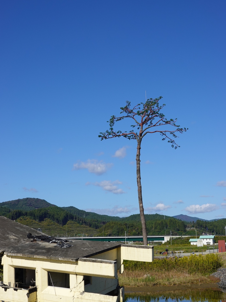 報道番組や雑誌などでしばしば目にしたことのある「奇跡の一本松」が、高田松原津波復興祈念公園の一画にあります。隣には震災遺構の「陸前高田ユースホステル」が被災したままの姿で残されており、青空を背景に力強くそびえる一本松の姿が印象的でした。