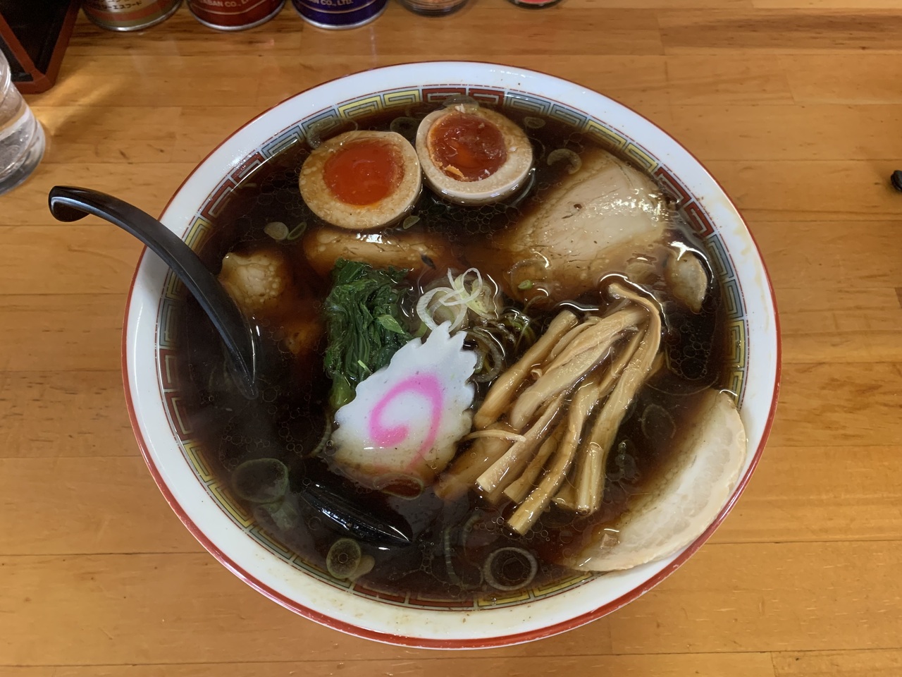 現れたラーメンは本当にブラックな見た目。見るからに塩辛そう。ところがびっくり、まろやかなスープ。これは美味しいですね。人気の理由がわかります。