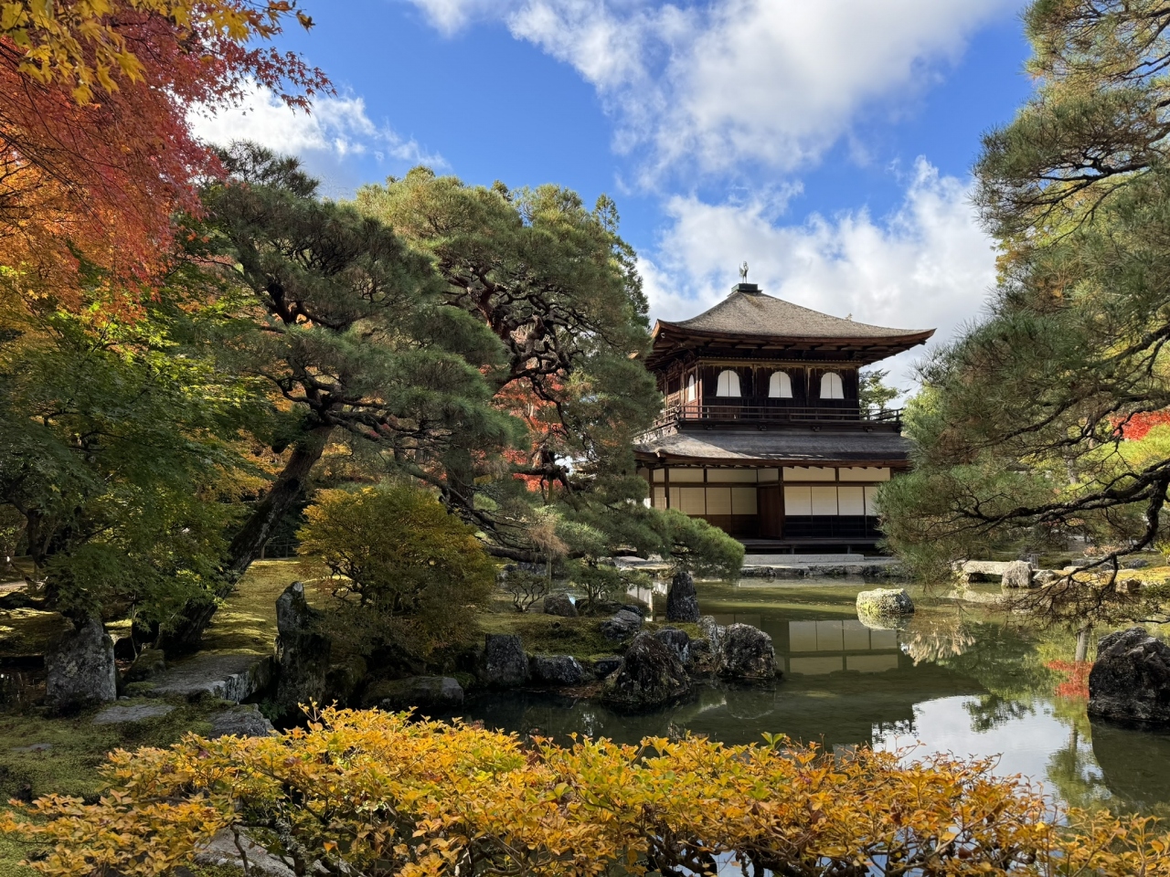銀閣寺の園内の庭園には、池の周囲から裏山の中ほどまで登って周回する散策路があります。メインの建物である「観音殿銀閣」と庭園との調和がきれいですが、一番の絶景はほぼ一周まわって出口付近のところ。池越しに観音殿銀閣の全体、そして屋根の上の鳳凰までをしっかりと見ることができます。