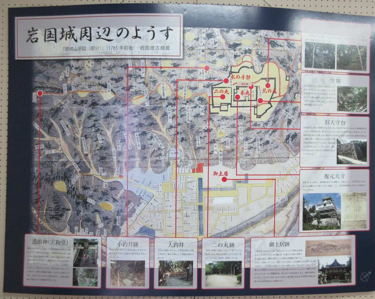 今の天守閣は昭和37年(1962)に復元されたもので、錦帯橋付近からの景観を考え、旧天守台から南に50m移動させて建てられました。