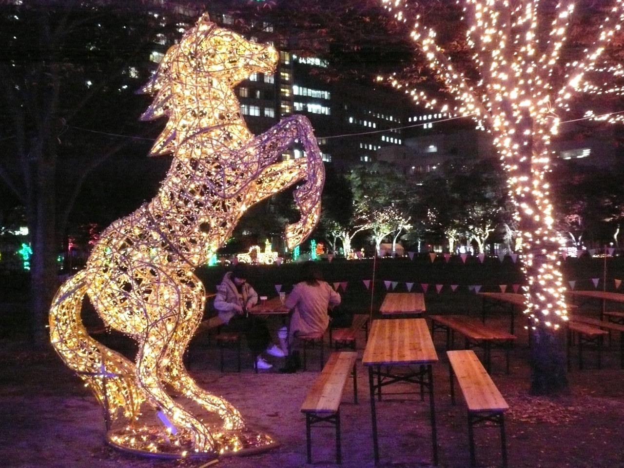 天神中央公園正面には高さ12mものシンボルツリーが出迎え、高さ4mのトナカイや馬に車などの形をしたイルミネーションのオブジェ、そして巨大な動くクマなど子供も大人もときめき輝く空間が楽しめまよ。