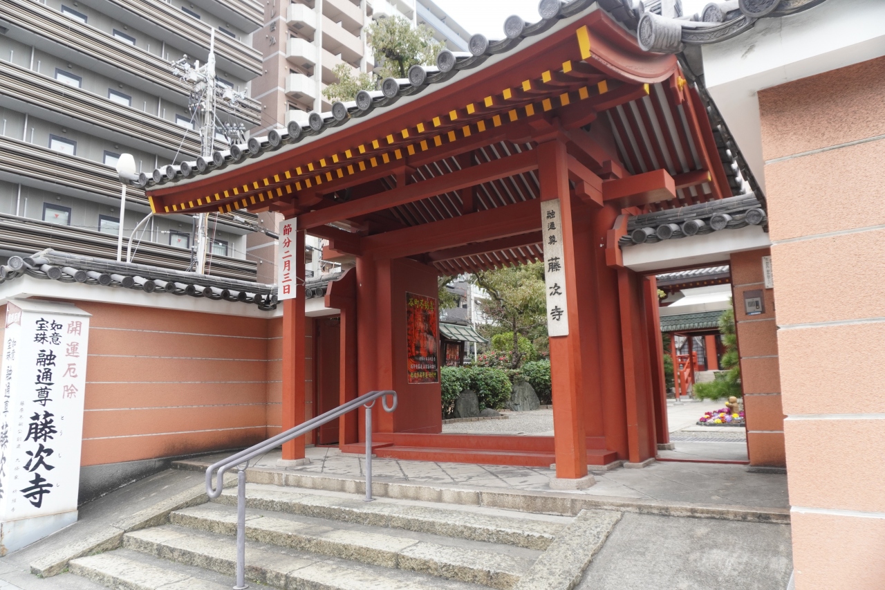 赤い塀に赤い山門の構えがちょっとインパクトあり。今は、如意宝珠融通尊への信仰によって「大阪の融通さん」とも呼ばれるようです。