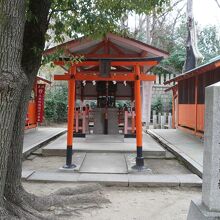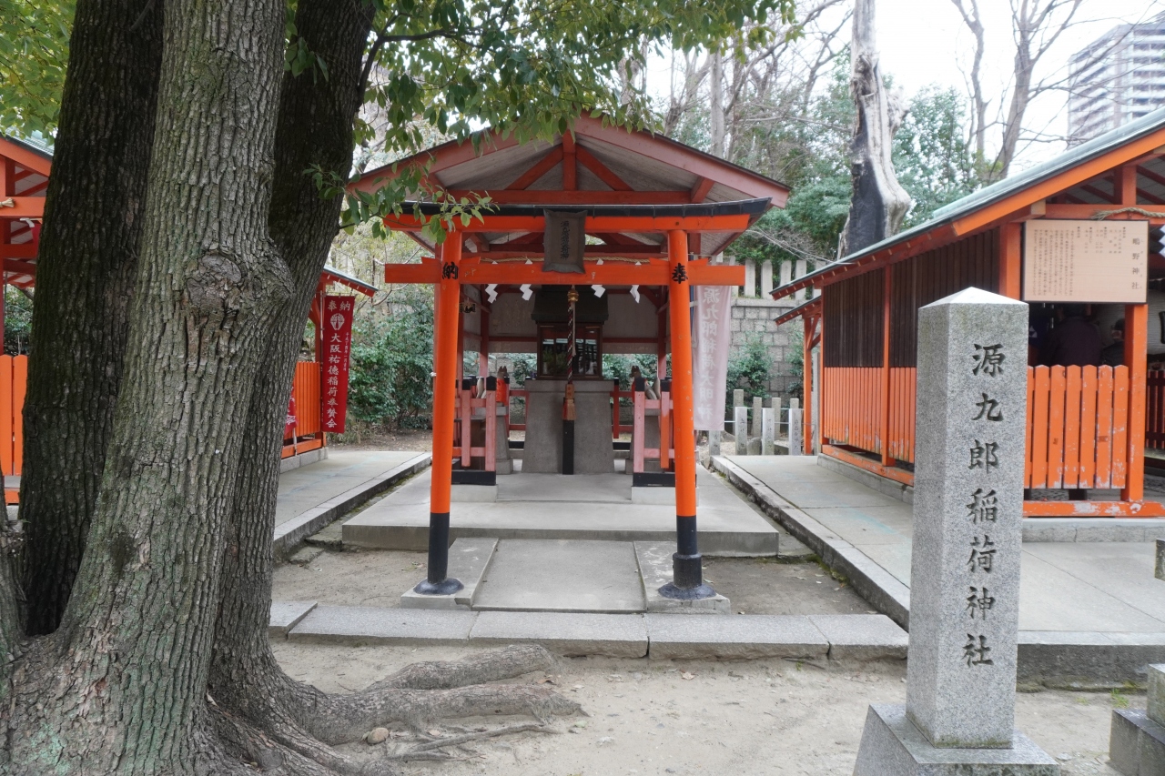 生國魂神社の境内にある源九郎稲荷神社。鴫野神社と稲荷神社に挟まれて三つの小さな神社が並んでいます。
