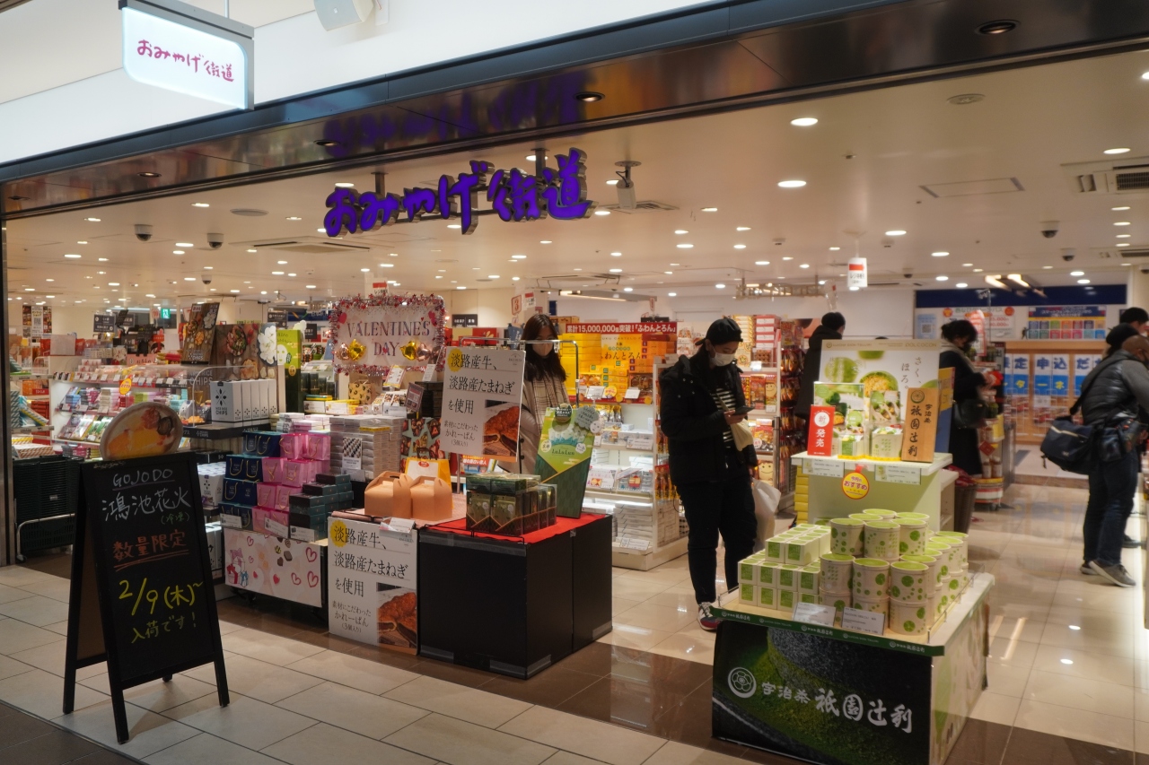 地下鉄の新大阪駅からJRの新大阪駅に乗り換える際のアルデ新大阪の一角にあるお土産物のお店。店内もそこそこ広いし、品ぞろえとかも悪くはないのですが、やっぱり乗り換えのために気持ちが急いているとこの場所だとやっぱりちょっと落ち着かないかな。少し難があるような気もします。