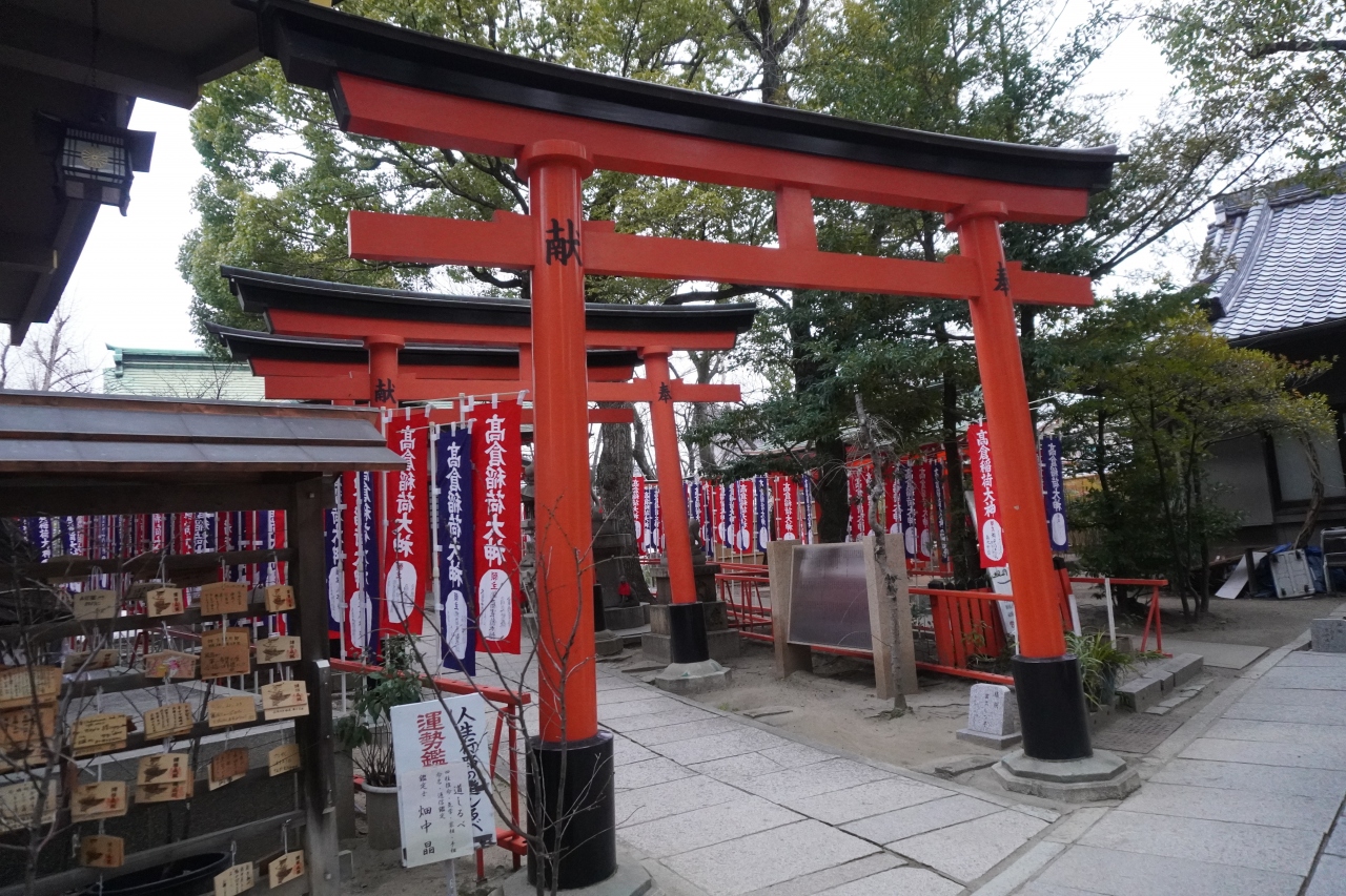 高倉稲荷神社は、高津宮の本殿に向かって右手にある境内摂社ですが、参道入り口には赤い鳥居が二本。参道に沿って両側には「高倉稲荷大神」の赤と紺の幟が何本も立ってなかなか盛況な雰囲気。社の方も軒破風のしっかりした造りです。
