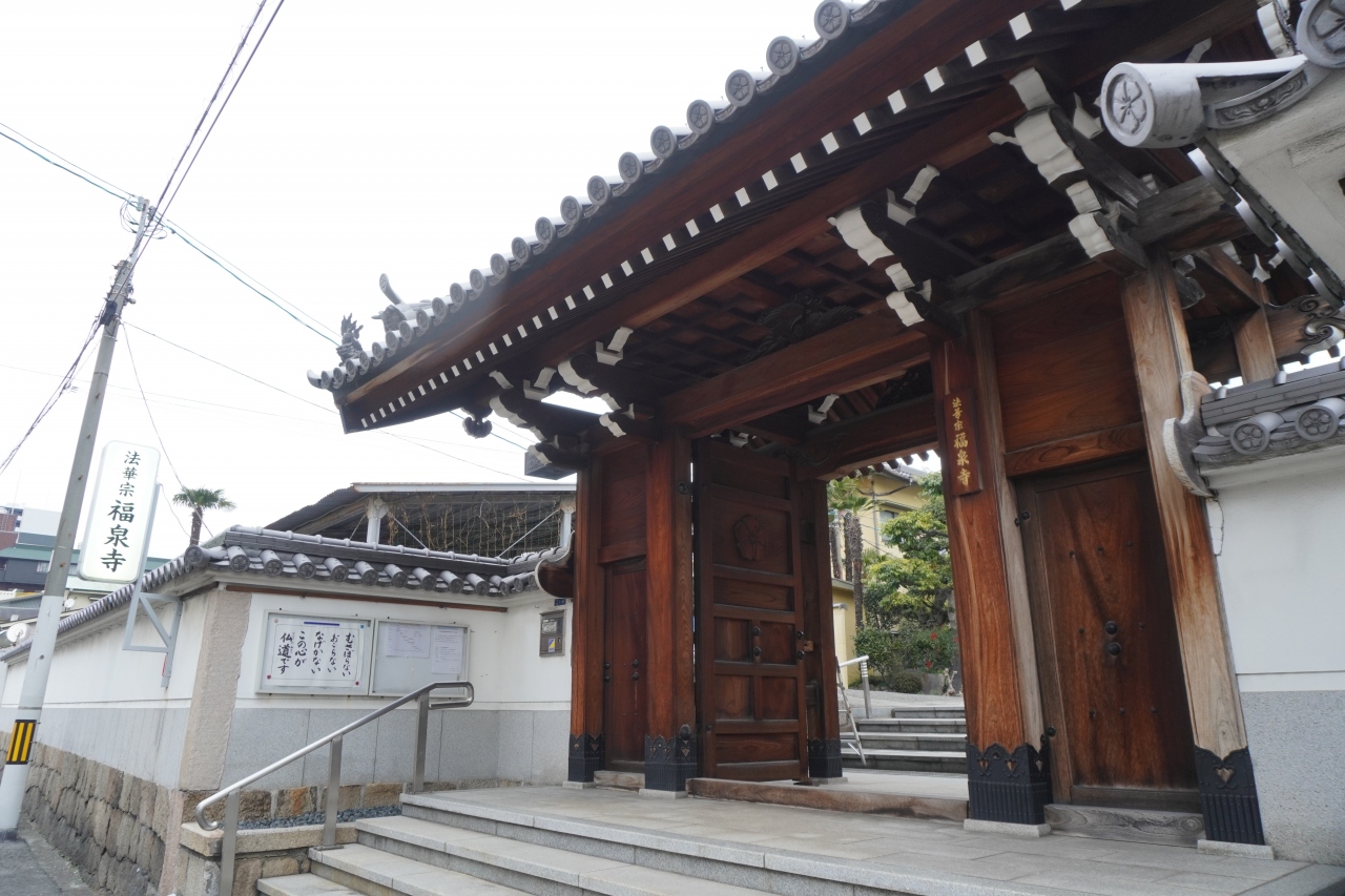 福泉寺は谷町筋の一本西の通り、西高津中寺町筋の東側。日蓮宗の一派、法華宗真門流のお寺。しっかりした木造の山門の奥には落ち着いたコンクリート敷の境内と正面には本堂が構える眺め。本堂の隣りに、堀部弥兵衛 堀部安兵衛 親子の墓もありました。