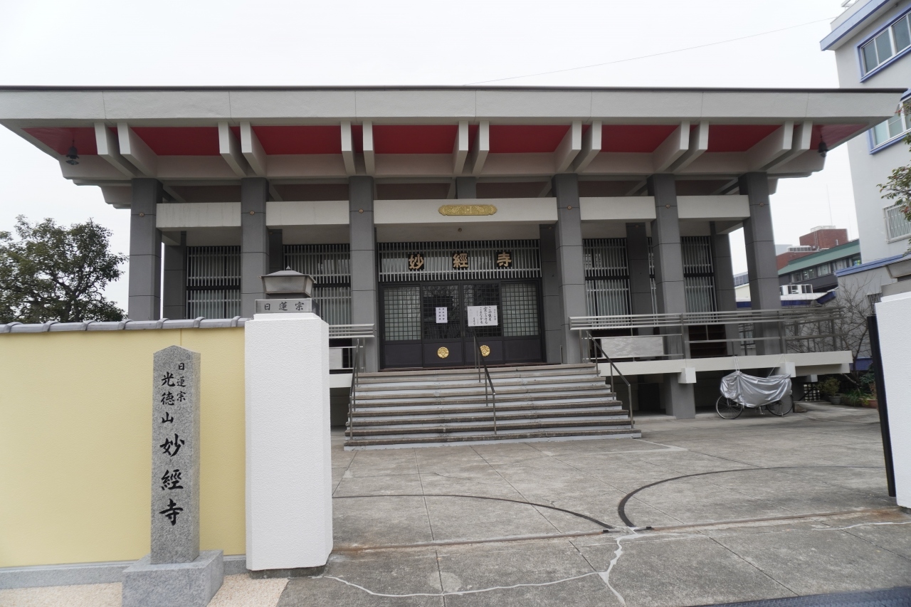 妙經寺は谷町筋に多くの寺が並ぶ寺町の一角。門前には「日蓮宗光徳山 妙經寺」の石柱。コンクリート敷の境内とその奥に鉄筋コンクリートの本堂が建っています。境内は狭くはないのですが、いかにも都会的な構えで風情はあまり感じないです。