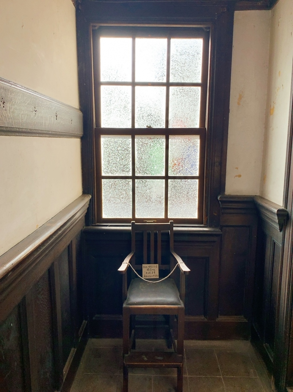 土日に限っては、2Fの旧電話交換室だったスペースを見学することが出来ます。 とは言っても当時の機材や家具などは何も置いてないただのスペースなのですが、大正建築を間近で見れるのは貴重です。 2Fは、階段でのアクセスのみで、土足厳禁なので、無造作に置いてあるクロックスのようなサンダルを履いて上ります。