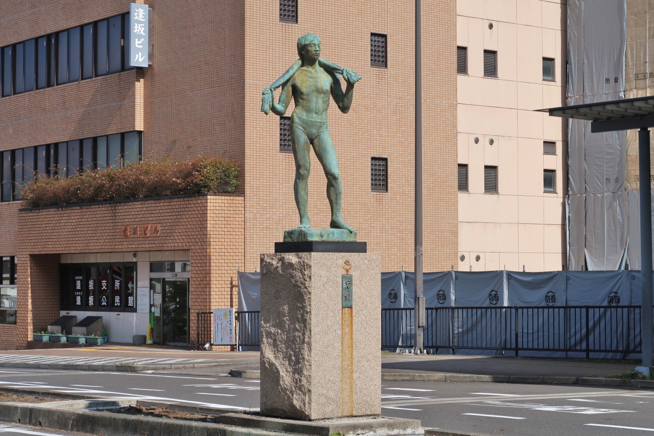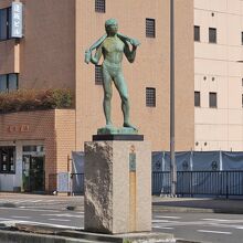 琵琶湖ホテルの無料シャトルバス乗り場を探して中央大通りを歩いていると、途中の中央分離帯の上に野外彫刻が設置されていました。滋賀県出身の彫刻家、山田 良定氏の作品で、水着姿の青年がバスタオルで体を拭きながら大津駅の方を見つめていました。「若鮎」の彫像のそばを通り過ぎると、左手にすぐバス乗り場が見えてきました。