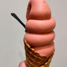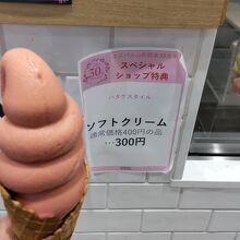 季節の果物ソフトクリームはイチゴとラ・フランスで、イチゴを選択しました。