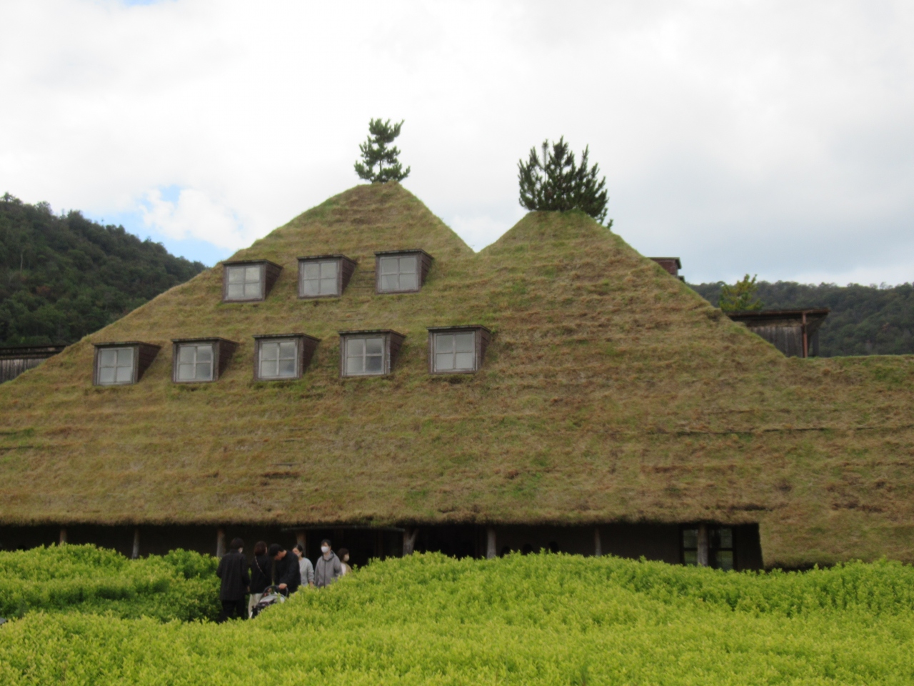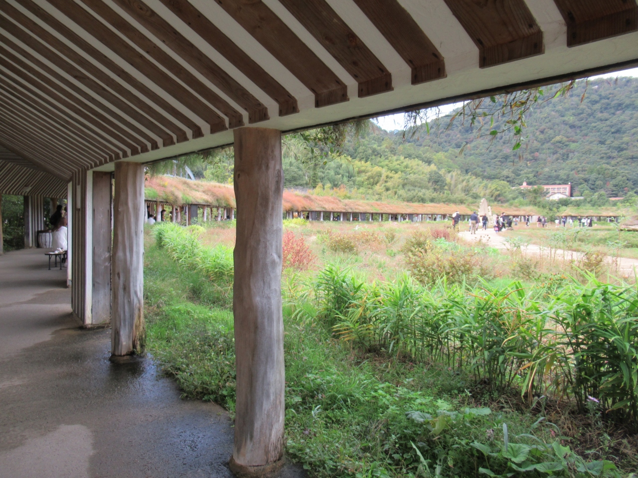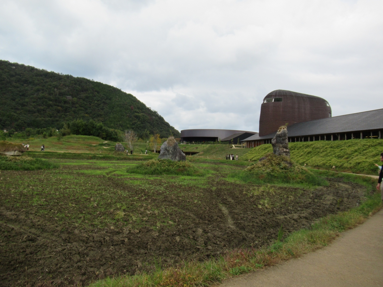 単にお菓子のショップなどが並んでいるのではなく、背後に八幡山、目の前の水郷地帯に囲まれた甲子園球場3個分もの広大な敷地に、円弧状の通路が配されて、通路の外側に草に覆われた建物などがあり、通路の内側には田んぼや石が並んでいます。