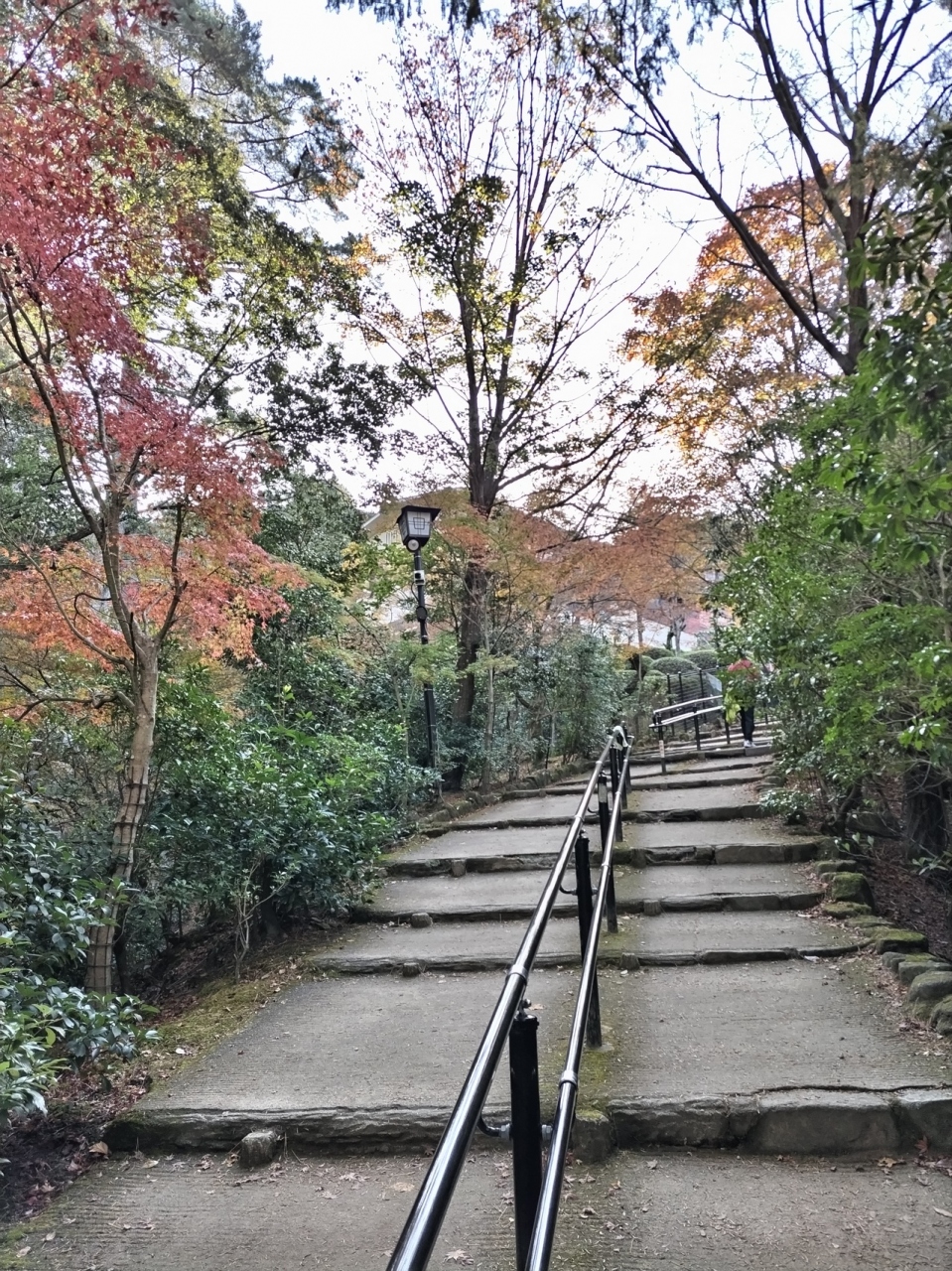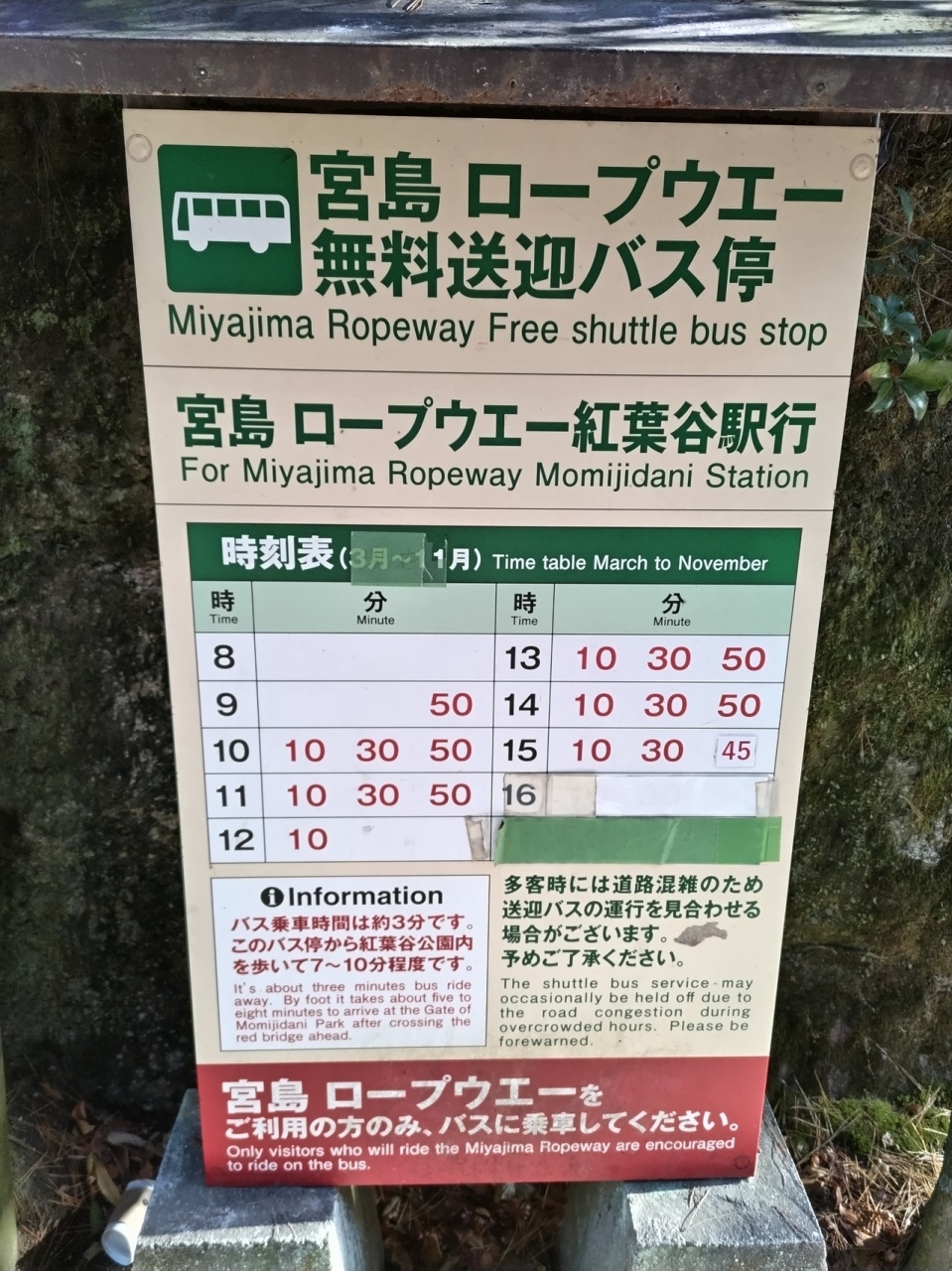 登りはホテル岩惣さんの前にバス停がありましたが、始発が9時50分で遅めで、あとは20分間隔です。お昼は便が少ないようです。最初は乗れば楽かなの思ったのですが、歩いても10分程で到着するし、公園の中の紅葉も楽しめました。無料なので高齢者や足の悪い方にはとても便利です。ところが行った日は紅葉の時期で、平日なのに観光客が多かったようで、運行停止になっていました。こんなこともあるのかと思いました。なのであまりあてにしないほうがいいかもです。