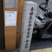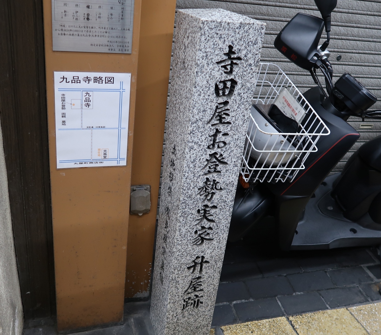 老舗和菓子店(←2023年7月に移転した模様。現在は「HOTEL 講 大津百町」の向かいあたり)の前に石碑がありました。寺田屋のお登勢の生家、升屋があった場所だそうです。龍馬が「おかあ」と呼ぶほど慕っていた寺田屋の女将がお登勢。升屋は大津の公事宿で、そちらを経営していた山本重助さんの次女とのこと。御両親のお墓のある九品寺への道案内の地図も貼ってありました。