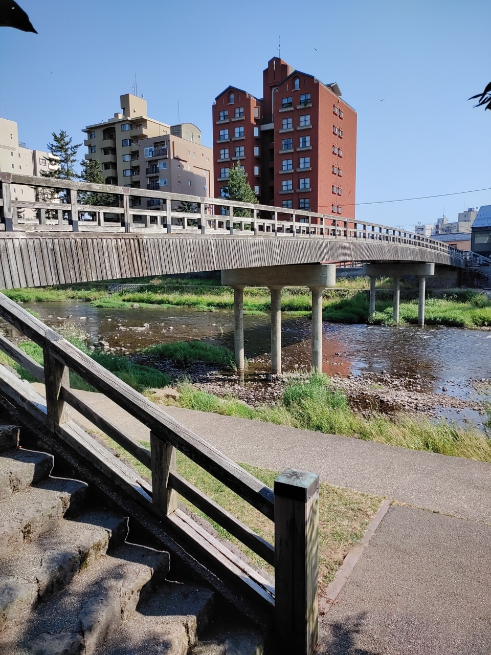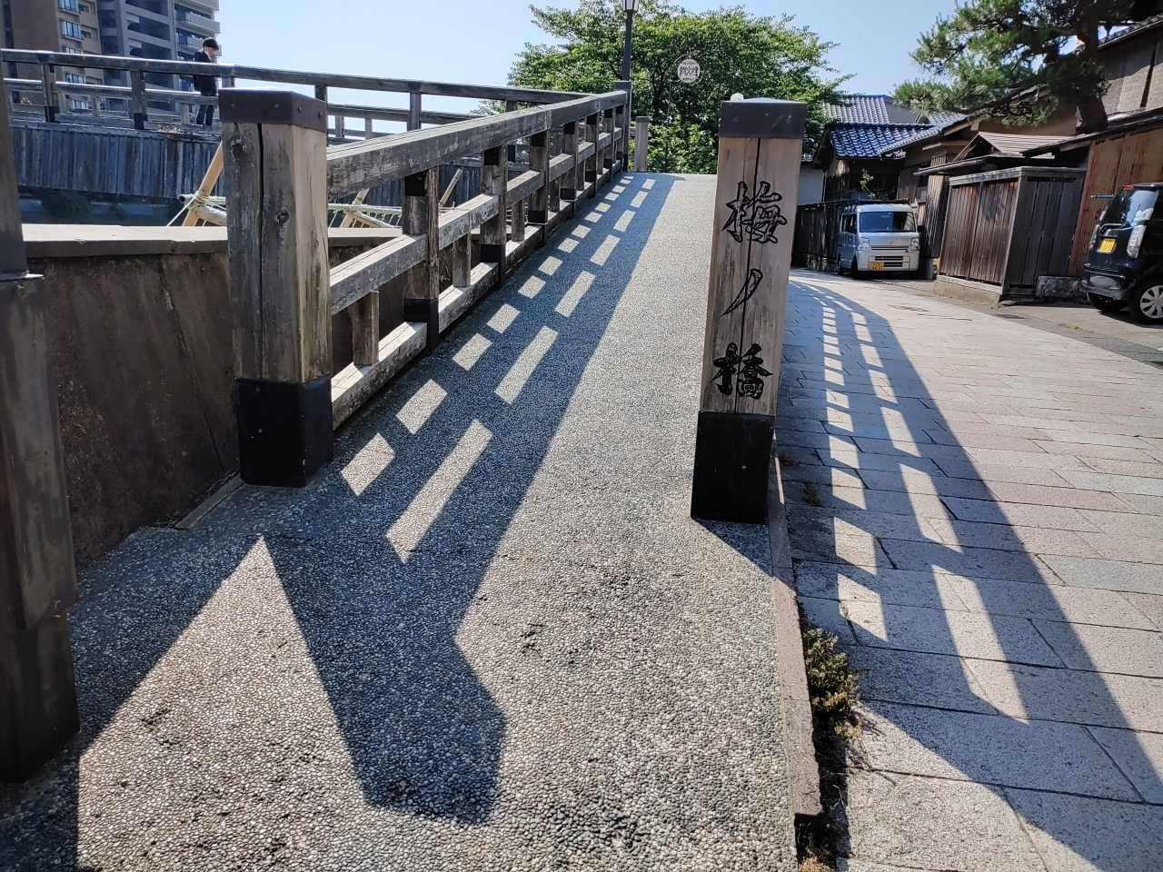 徳田秋聲記念館の前にある,浅野川に架かる木製の橋で,歩行者専用になっています.元々は明治時代にかけられたようですが,何度か水害により破壊され,現在の橋はコンクリートの土台が使われています.近くにある浅野大橋が,常に交通渋滞なのと比べると,こちらの橋は風情があり,また渡る人もそれほど多くはないので,のんびりと川面を眺めることも出来ました.